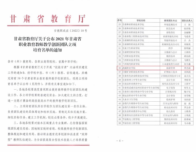 經(jīng)濟(jì)管理學(xué)院晉藝波負(fù)責(zé)的“旅游管理”專(zhuān)業(yè)教學(xué)團(tuán)隊(duì)獲評(píng)甘肅省職業(yè)教育教師教學(xué)創(chuàng)新團(tuán)隊(duì)。