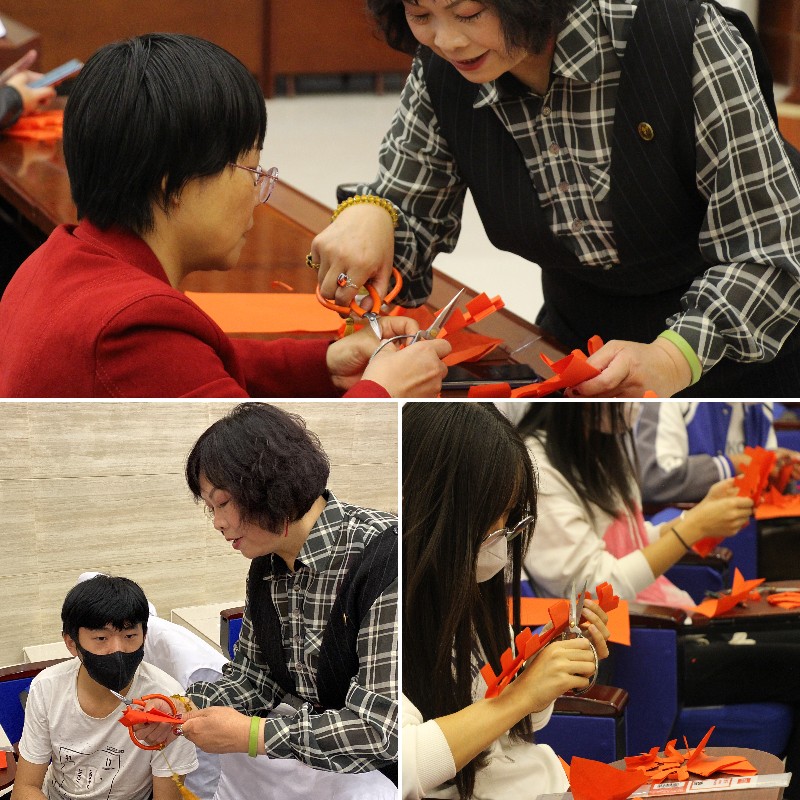 鄭霞從剪紙風(fēng)格、剪紙技巧、剪紙?jiān)瓌t等方面深入淺出地介紹了剪紙技藝的基本理論,并為學(xué)校捐贈(zèng)了2幅剪紙作品,展示了16幅系列作品,得到師生一致好評(píng)。講座最吸引人的是動(dòng)手實(shí)操環(huán)節(jié),鄭霞老師親身傳藝,為與會(huì)的師生展示了五星、喜字、窗花等的剪法,與會(huì)者興致勃勃地參與其中,喜悅與驚呼隨著作品一起迸發(fā)。許多學(xué)生表示,剪紙藝術(shù)很有魅力,愿意跟隨鄭霞老師學(xué)習(xí)技藝,做中華文明的傳承者。