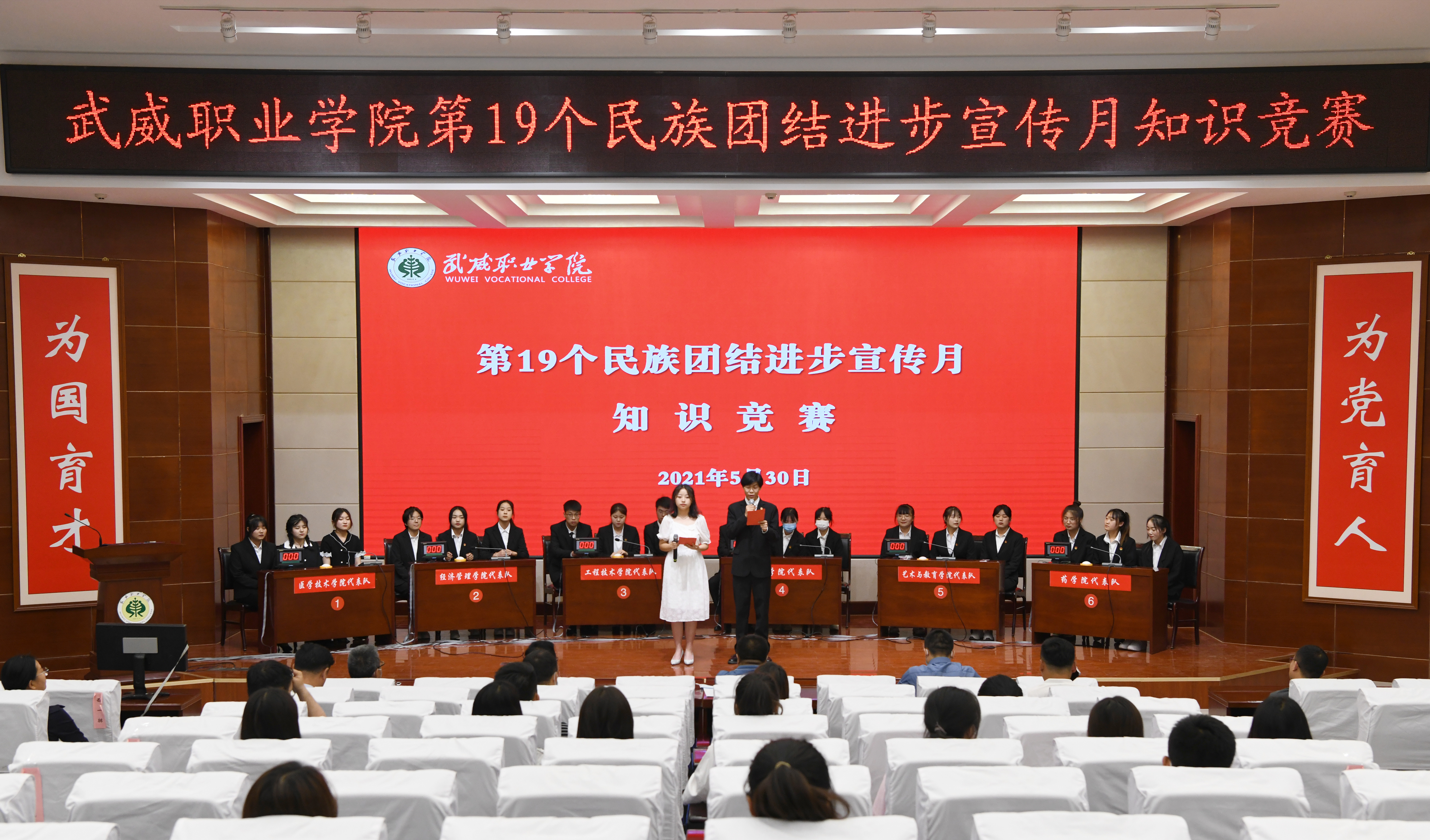 經(jīng)過前期的初賽、復(fù)賽,共有6支參賽隊進(jìn)入知識競賽決賽,競賽內(nèi)容涵蓋了習(xí)近平新時代中國特色社會主義思想、中央民族工作會議精神、中華民族歷史發(fā)展知識、各民族優(yōu)秀傳統(tǒng)文化、中國夢等方面內(nèi)容,充分彰顯了中華民族一家親、同心共筑中夢的精神。競賽中,參賽選手以飽滿的精神,踴躍答題,你追我趕,氣氛十分熱烈。經(jīng)過激烈的角逐,藥學(xué)院獲得此次知識競賽第一名。醫(yī)學(xué)技術(shù)學(xué)院獲得學(xué)校第19個民族團(tuán)結(jié)進(jìn)步宣傳月系列活動優(yōu)秀組織獎。