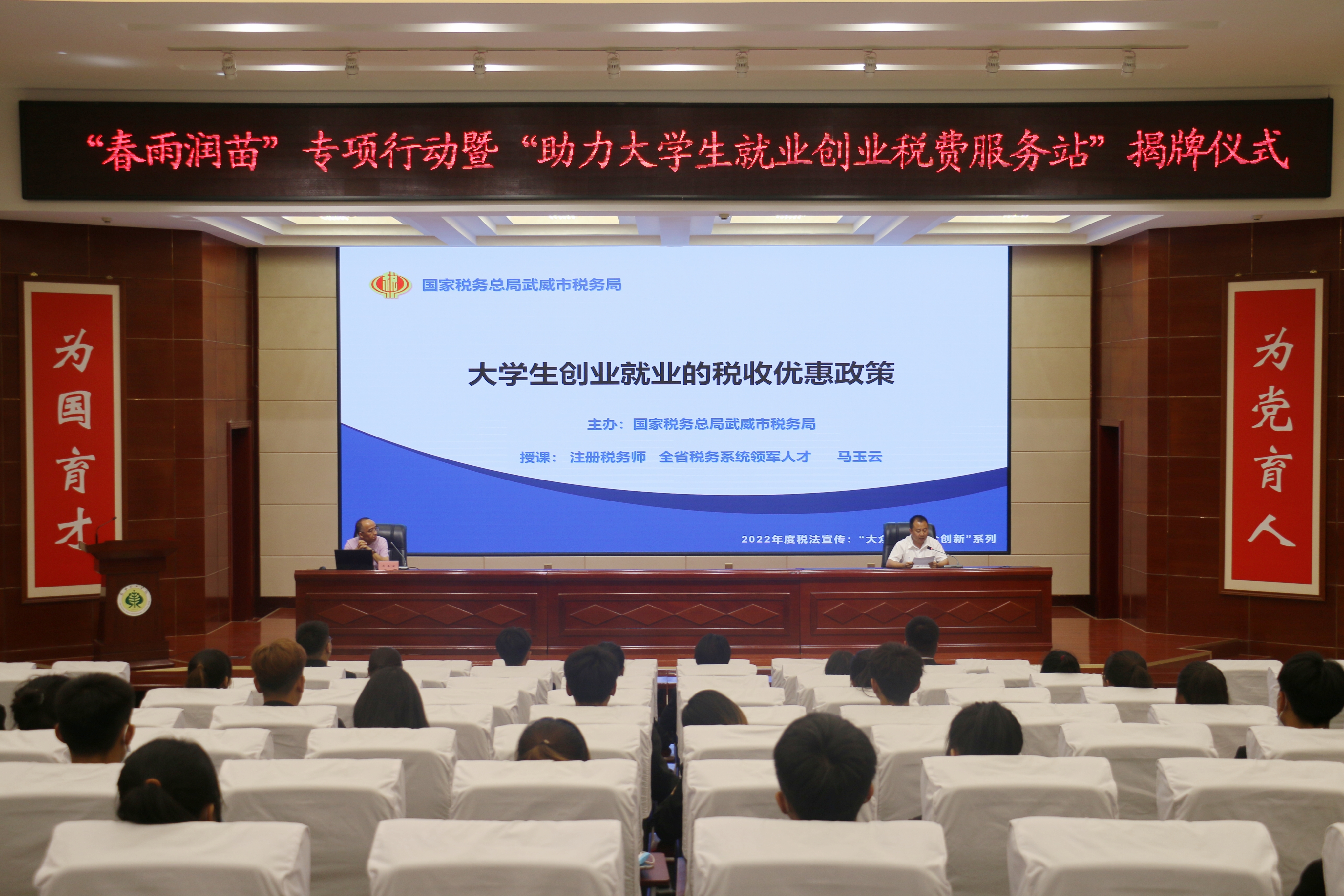 6月10日下午,武威市稅務(wù)局聯(lián)合工商聯(lián)在學(xué)校菁英廳舉辦“春雨潤苗”專項(xiàng)行動(dòng)暨“助力大學(xué)生就業(yè)創(chuàng)業(yè)稅費(fèi)服務(wù)站”揭牌儀式。武威市稅務(wù)局黨委委員、副局長劉永德,武威市工商聯(lián)副主席張連科,涼州區(qū)工商聯(lián)副主席唐紅生,學(xué)校黨委委員、副校長田迎春出席揭牌儀式,涼州區(qū)稅務(wù)局黨委委員、副局長李斌盛主持活動(dòng)。武威市稅務(wù)局黨委委員、副局長劉永德在講話中指出“助力大學(xué)生就業(yè)創(chuàng)業(yè)稅費(fèi)服務(wù)站”的成立,既是武威稅務(wù)部門優(yōu)化稅費(fèi)服務(wù)的有力舉措,也是學(xué)院、工商聯(lián)和稅務(wù)的一次深入合作,更是三方匯聚合力,助力穩(wěn)就業(yè)、保民生、促發(fā)展的積極作為?!?/p>