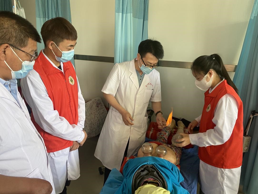 圖4- 對雙城鎮(zhèn)安全村民免費進(jìn)行拔罐治療