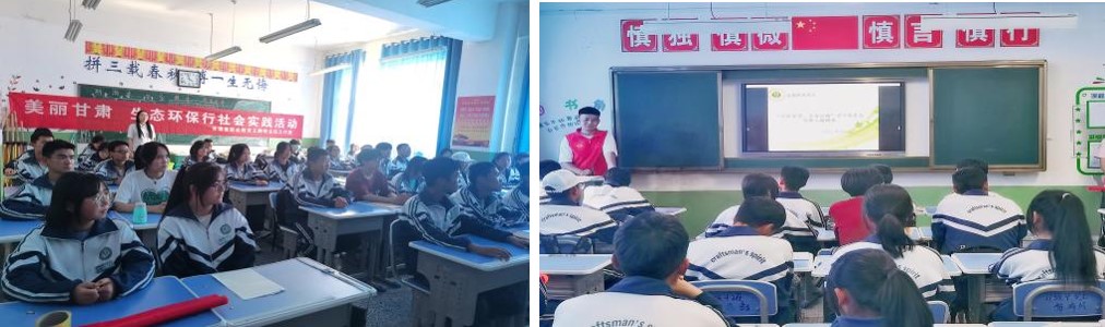 團隊成員在天祝職業(yè)中專教務處主任張健瑞教師的指引來到21級3班,志愿者通過播放PPT向同學們宣講了生態(tài)環(huán)保的重要性以及國家對于生態(tài)環(huán)保的做出工作部署及法律法規(guī),并且向同學們進行提問了生態(tài)環(huán)保知識、發(fā)放了調查問卷。