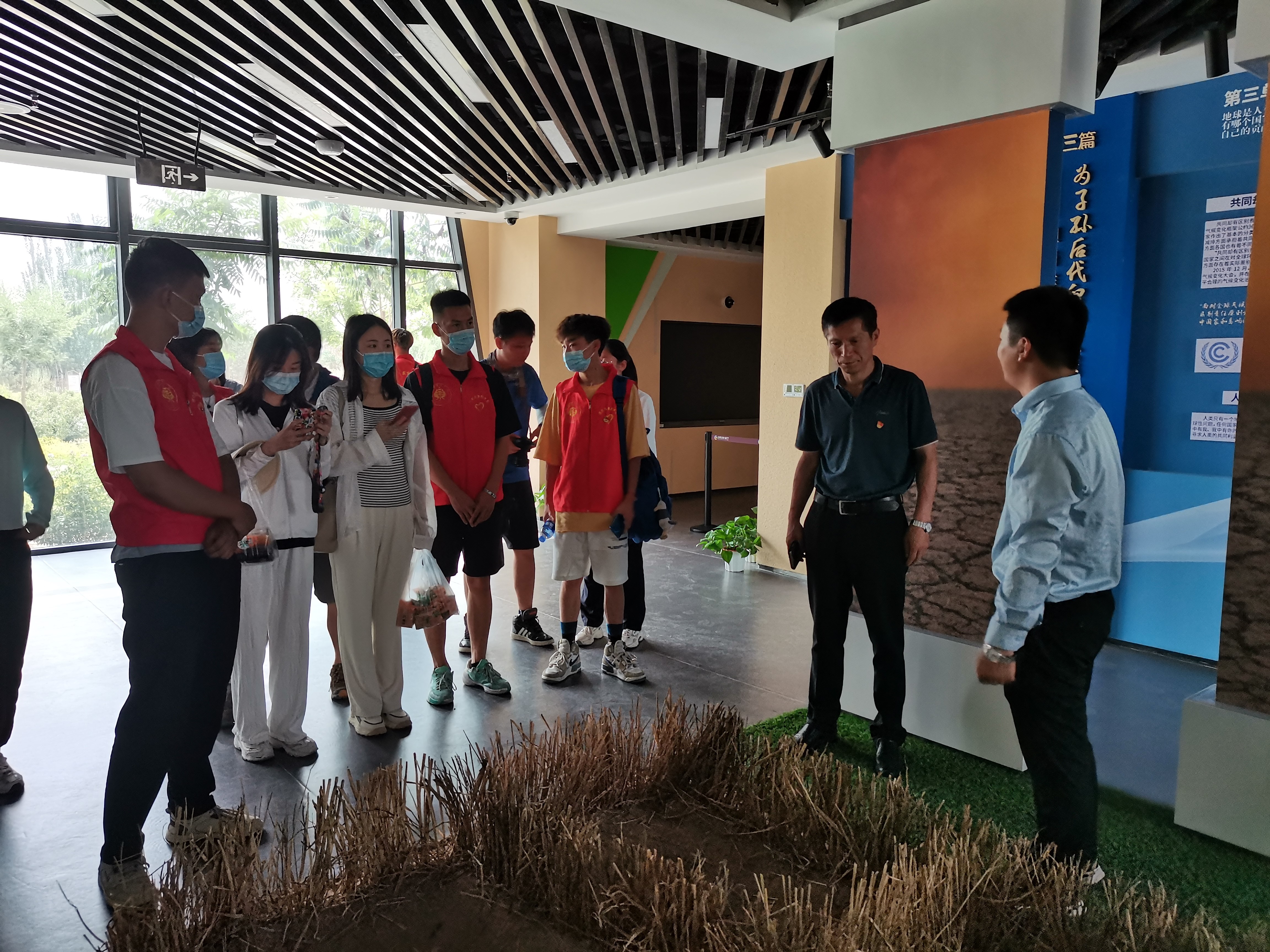 在八步沙兩山實(shí)踐基地展覽館內(nèi),實(shí)踐團(tuán)成員與來(lái)八步沙兩山實(shí)踐基地參觀學(xué)習(xí)的常州紡織職業(yè)技術(shù)學(xué)院老師共同聆聽(tīng)了工作人員的講解,通過(guò)工作人員的講解,我們了解到:“在上世紀(jì)六七十年代八步沙周邊受風(fēng)沙影響較大,生態(tài)環(huán)境十分惡劣,所以,也就有了“一夜北風(fēng)沙騎墻,早上起來(lái)綠上房”的說(shuō)法,為了保護(hù)家園,六老漢他們拿起鐵鍬開(kāi)始一樹(shù)一坑一桶水的傳統(tǒng)治沙,組建八步沙集體林場(chǎng),經(jīng)過(guò)反復(fù)摸索,在艱苦惡劣的環(huán)境中開(kāi)啟了艱辛治理征程,實(shí)現(xiàn)了從“沙進(jìn)人退”到“人進(jìn)沙退”的歷史性轉(zhuǎn)變,六老漢不享兒孫繞膝福、甘守大漠獻(xiàn)余生的事跡也被得到了廣為流傳。