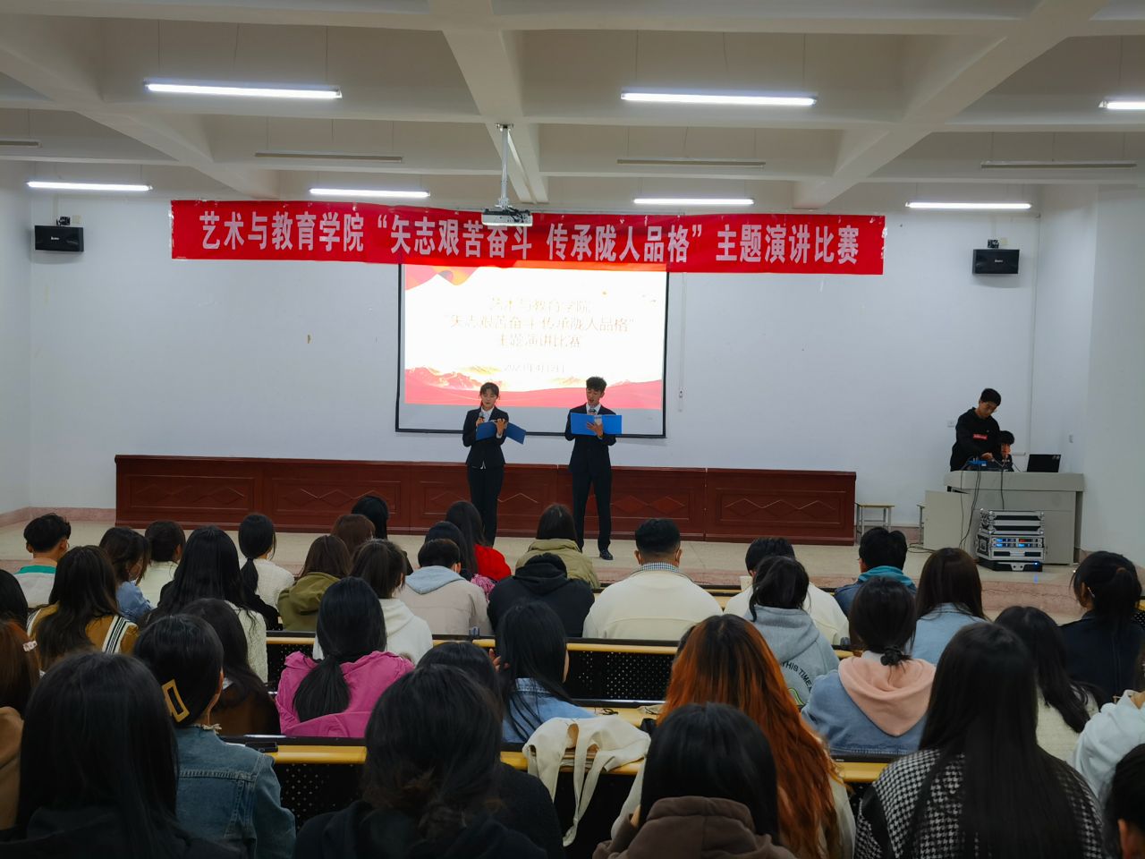 2023年4月2日,藝術(shù)與教育學(xué)院在勵(lì)勤樓階梯教室舉辦“矢志艱苦奮斗·傳承隴人品格”主題演講比賽。全院200多名學(xué)生觀看了比賽。