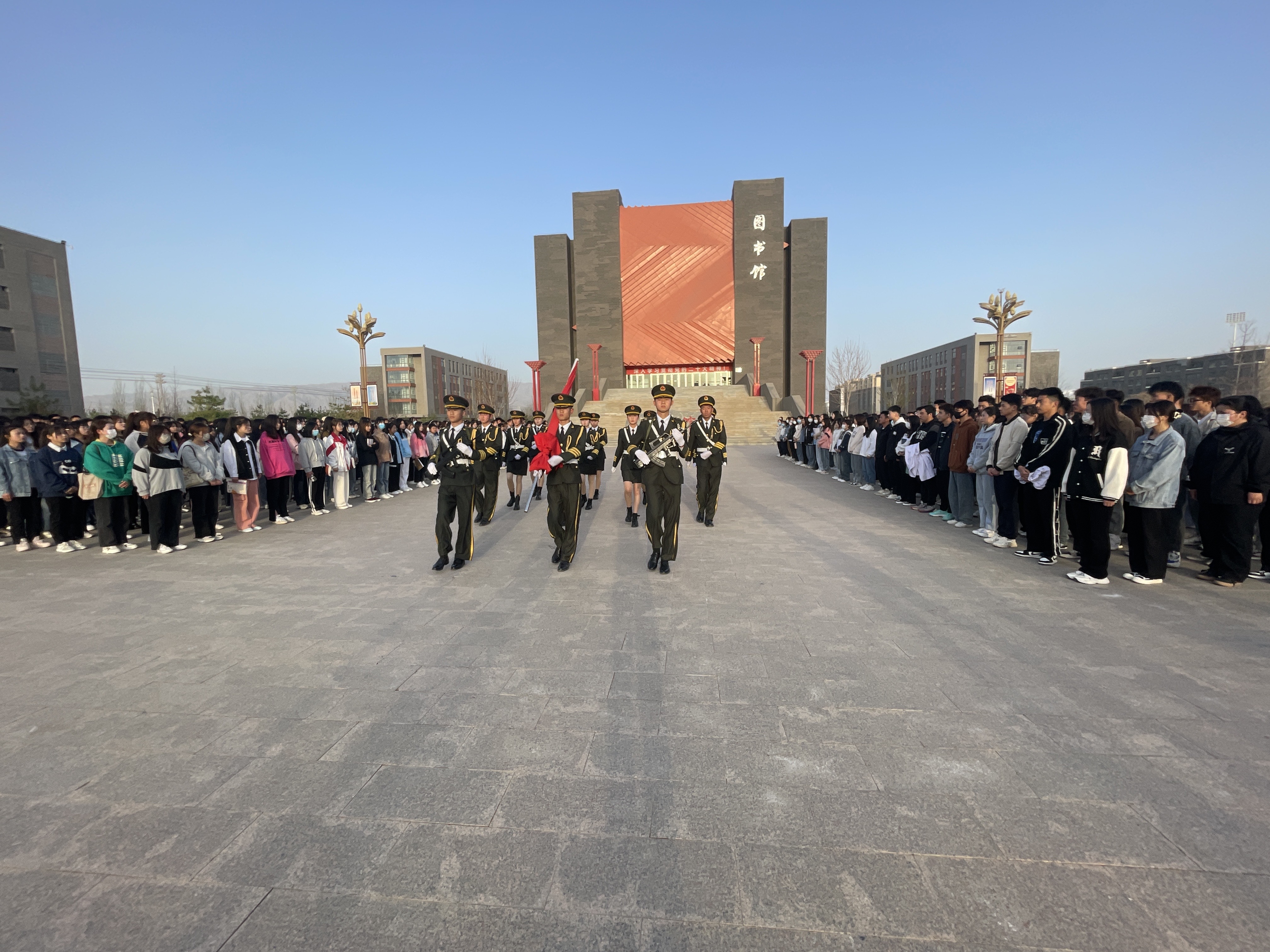 4月17日上午,醫(yī)學(xué)技術(shù)學(xué)院在學(xué)校圖書(shū)館東廣場(chǎng)舉行升國(guó)旗儀式,全體師生參加。