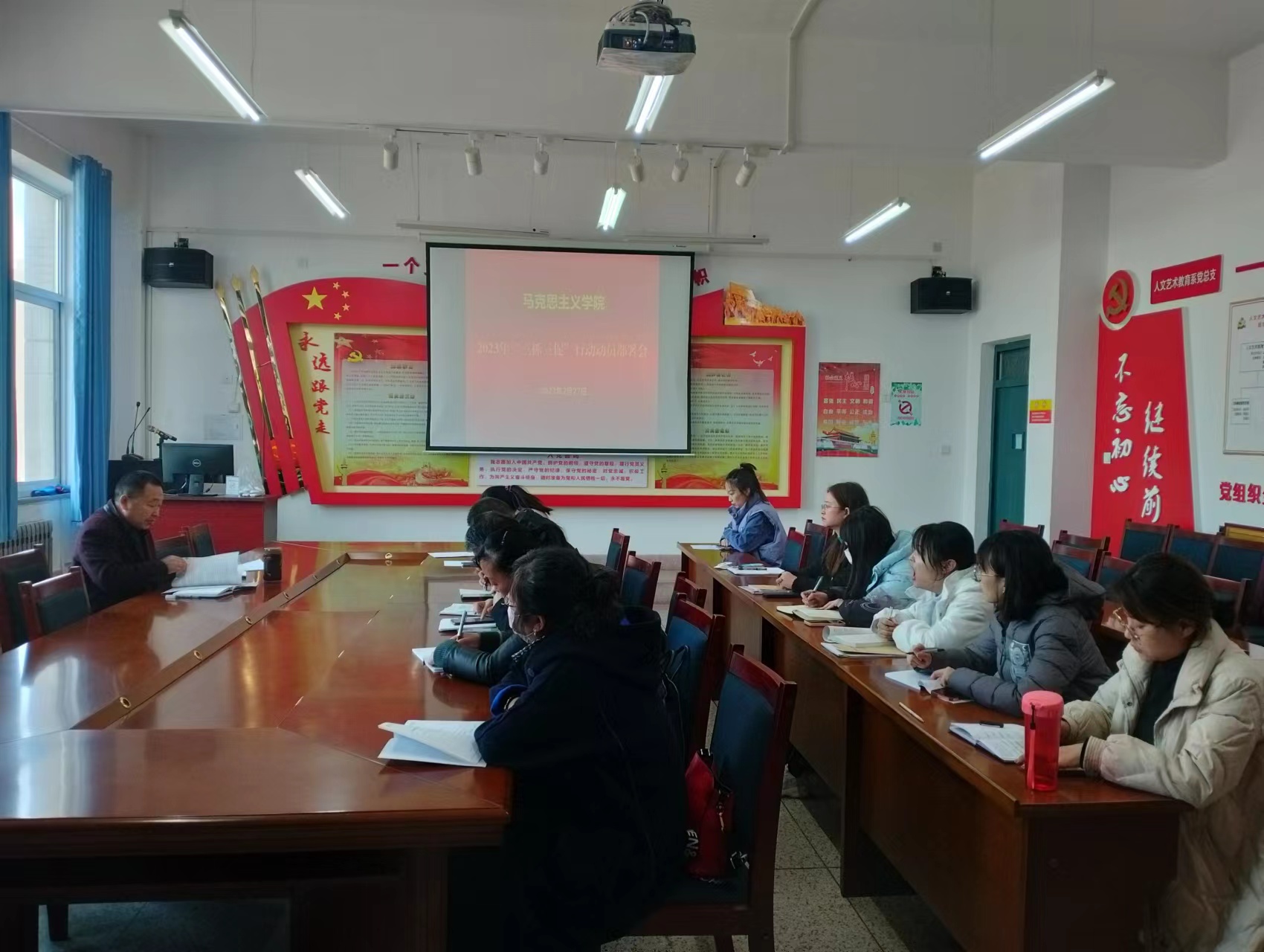近日,按照學(xué)?!叭ト佟毙袆觿訂T部署會要求,馬克思主義學(xué)院第一時間召開會議,統(tǒng)一思想,明確任務(wù),召開“三抓三促”行動動員部署會,學(xué)院負責(zé)人劉心主持會議,全體思政課教師參加了會議。
