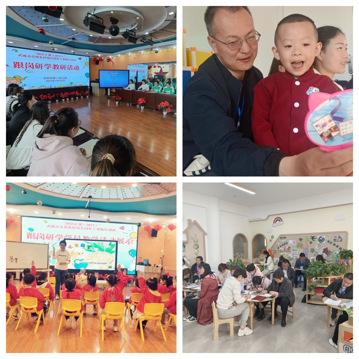在跟崗研修期間,學(xué)員們分組進(jìn)入武威市實(shí)驗(yàn)幼兒園、武威市第二實(shí)驗(yàn)幼兒園、涼州區(qū)第一、第二、第四幼兒園進(jìn)行跟崗學(xué)習(xí)。走進(jìn)幼兒園,感受優(yōu)美的園所環(huán)境和先進(jìn)辦園理念,學(xué)習(xí)幼兒園班級建設(shè)、區(qū)角打造、環(huán)境布置、課程設(shè)置等。走進(jìn)課堂,觀摩優(yōu)質(zhì)示范課,同課異構(gòu)課,體智能特色課,開展聽課、講課、評課、議課、研討交流活動,體驗(yàn)先進(jìn)的學(xué)前教育理念,增強(qiáng)了全體學(xué)員扎根學(xué)前教育的熱情和信念,開拓的學(xué)員眼界,提升了業(yè)務(wù)能力。4月21日,各幼兒園開展跟崗研修總結(jié)活動,導(dǎo)師學(xué)員談收獲,談體會,在團(tuán)隊(duì)共進(jìn)中內(nèi)化學(xué)習(xí)內(nèi)容。