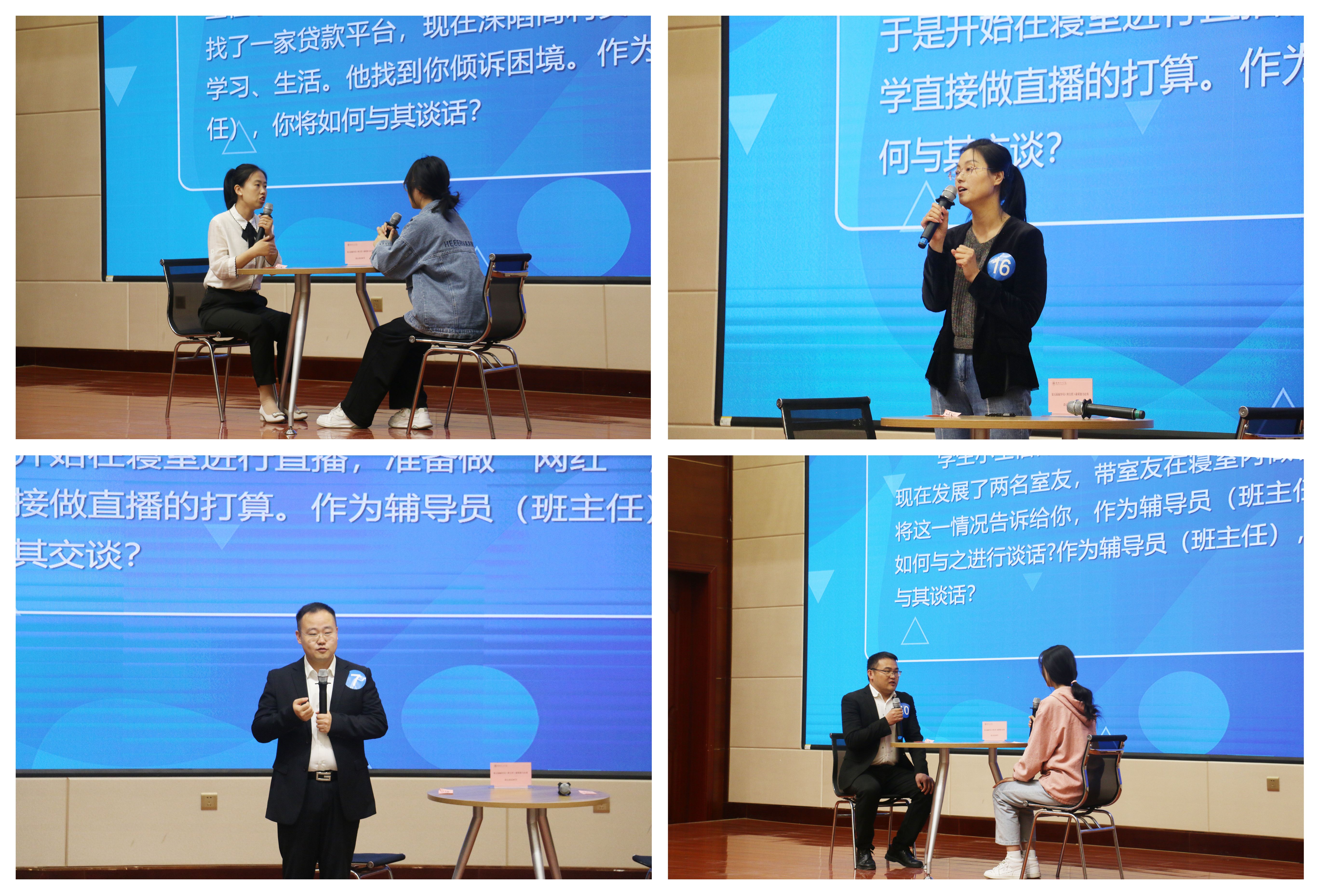 4月20日,談心談話環(huán)節(jié)在菁英廳進(jìn)行。比賽中,面對(duì)“問題百變”的參演學(xué)生,參賽選手從學(xué)生特征、學(xué)生成長、成才規(guī)律等方面進(jìn)行了耐心、細(xì)致的談心談話,充分展示了輔導(dǎo)員、班主任對(duì)學(xué)生的教育引導(dǎo)、解決思想困惑和處理實(shí)際問題的能力。