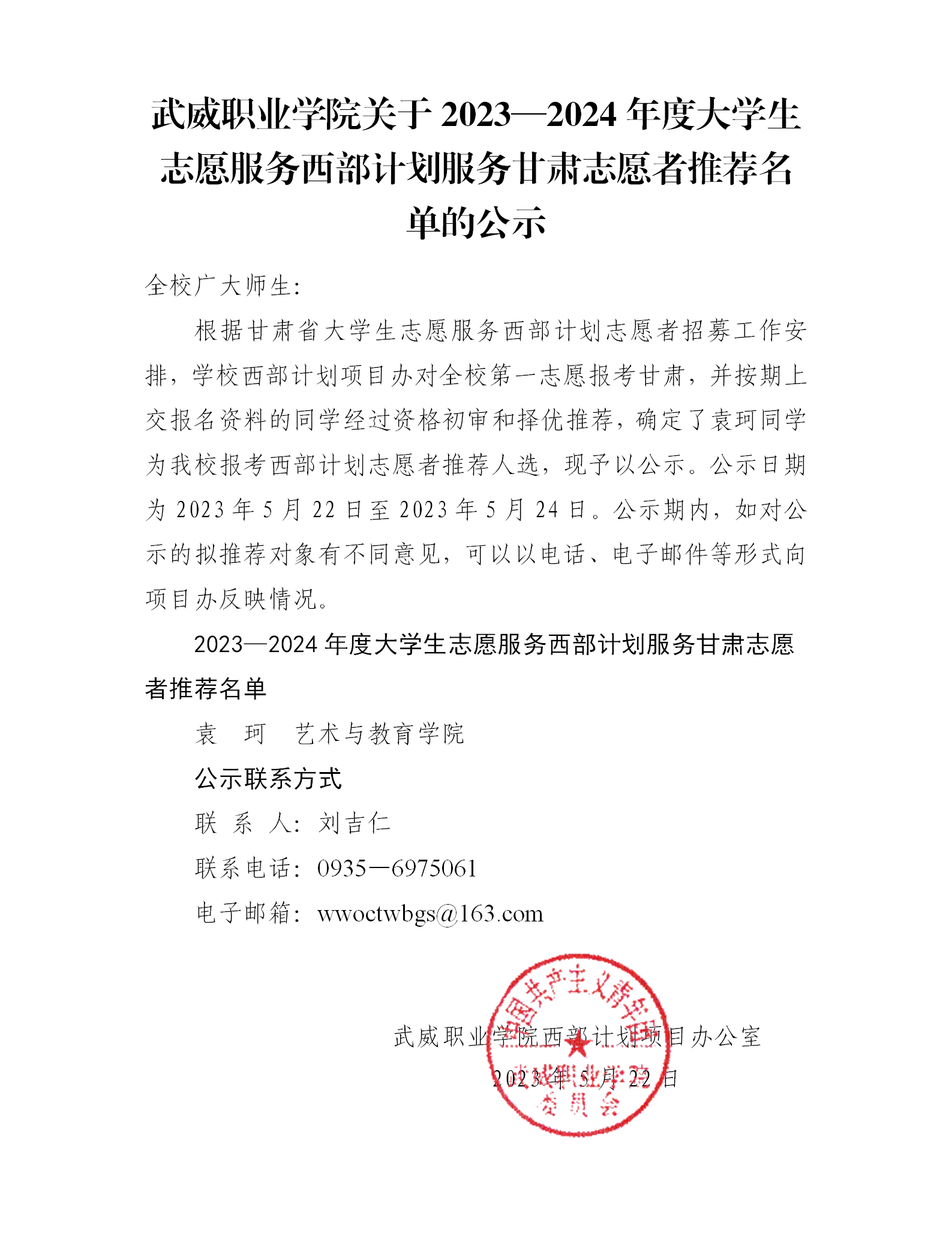 武威職業(yè)學院關(guān)于2023—2024年度大學生志愿服務西部計劃服務甘肅志愿者推薦名單的公示