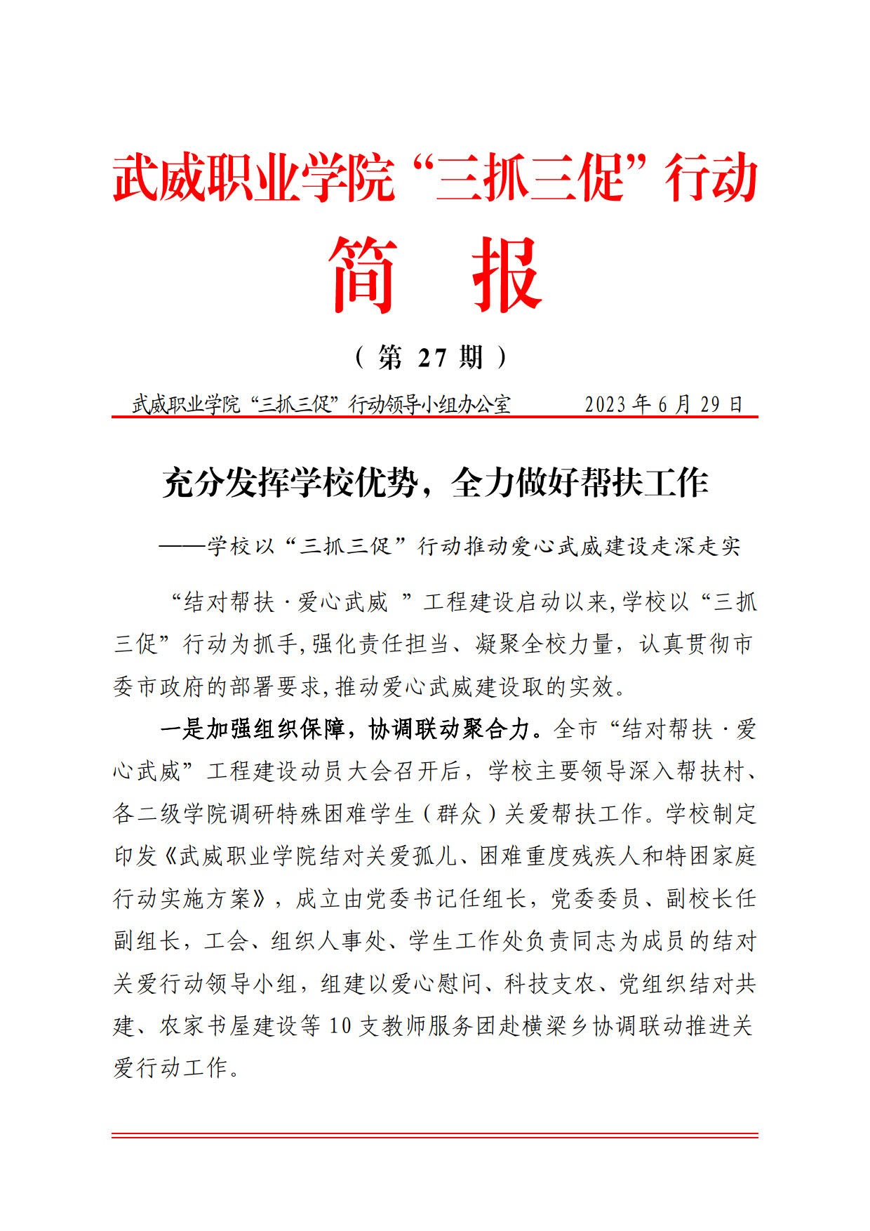 簡報(bào)第27期:充分發(fā)揮學(xué)校優(yōu)勢,全力做好幫扶工作——學(xué)校以“三抓三促”行動(dòng)推動(dòng)愛心武威建設(shè)走深走實(shí)