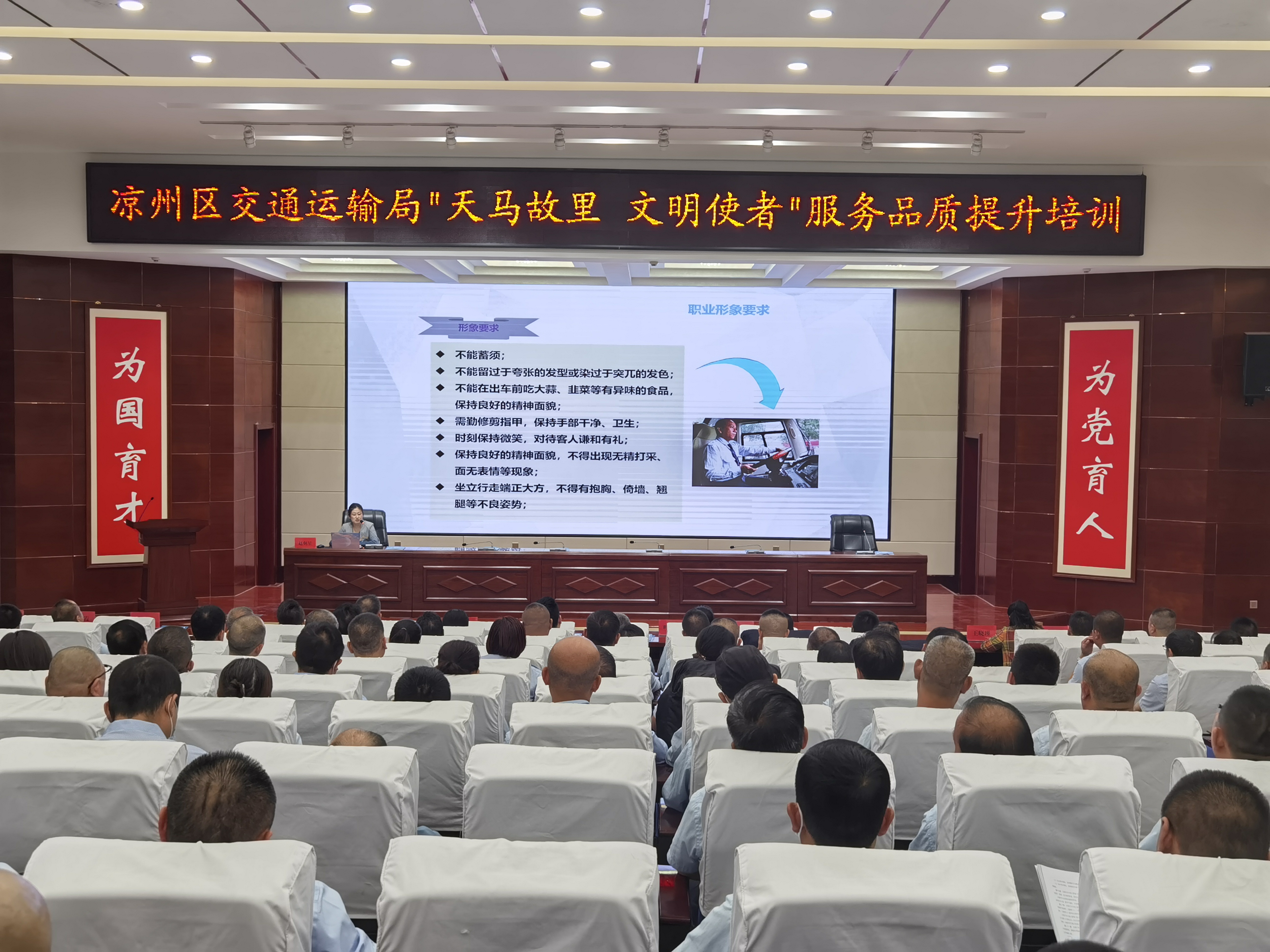 6月28日,“天馬故里 文明使者”客運企業(yè)從業(yè)人員服務(wù)品質(zhì)提升培訓(xùn)班在武威職業(yè)學(xué)院開班。市交通局副局長柴天祥,區(qū)委常委、統(tǒng)戰(zhàn)部部長、區(qū)政協(xié)黨組書記許娜,市交通運輸綜合行政執(zhí)法隊隊長韓世泰,市運管局副局長許培明,學(xué)校黨委委員、副校長王守云出席開班儀式。開班式由涼州區(qū)交通運輸局副局長蘇銀堂主持,出租客運公司、城市公交公司和定制客運公司管理人員及從業(yè)人員220人參加開班儀式。
