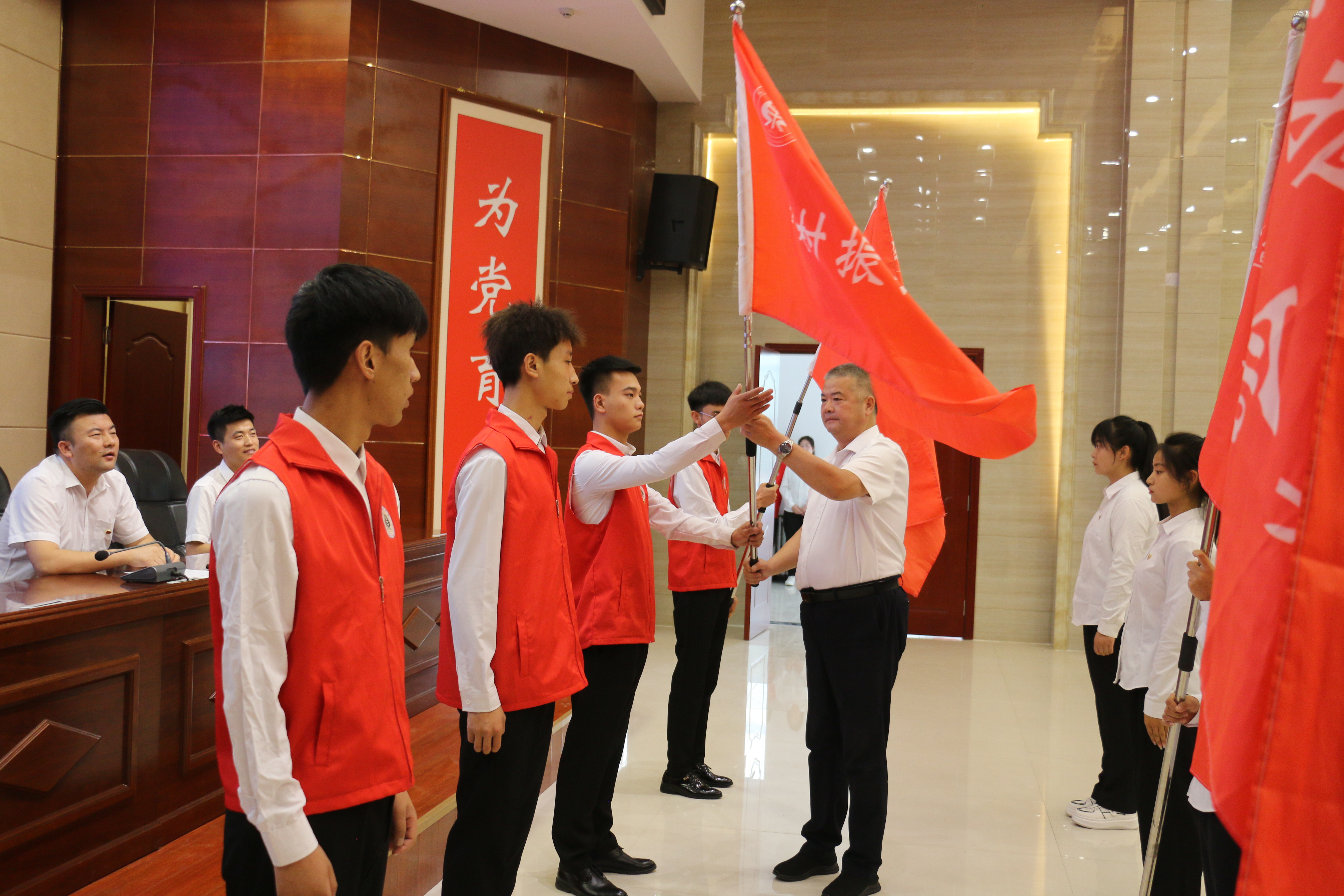 王守云為各實(shí)踐服務(wù)團(tuán)隊(duì)授旗。志愿者代表候昊燁代表全體隊(duì)員莊嚴(yán)承諾,遵守紀(jì)律,克服困難,團(tuán)結(jié)協(xié)作,全力以赴,力爭圓滿地完成預(yù)定的各項(xiàng)實(shí)踐任務(wù)。指導(dǎo)教師代表姚盈老師發(fā)言,介紹了“直播帶貨-非遺傳承”鄉(xiāng)村振興促進(jìn)團(tuán)的實(shí)踐計(jì)劃情況,號(hào)召老師和同學(xué)們深入基層一線,用腳步丈量祖國大地,用眼睛發(fā)現(xiàn)中國精神,用耳朵傾聽人民呼聲,用內(nèi)心感應(yīng)時(shí)代脈搏。