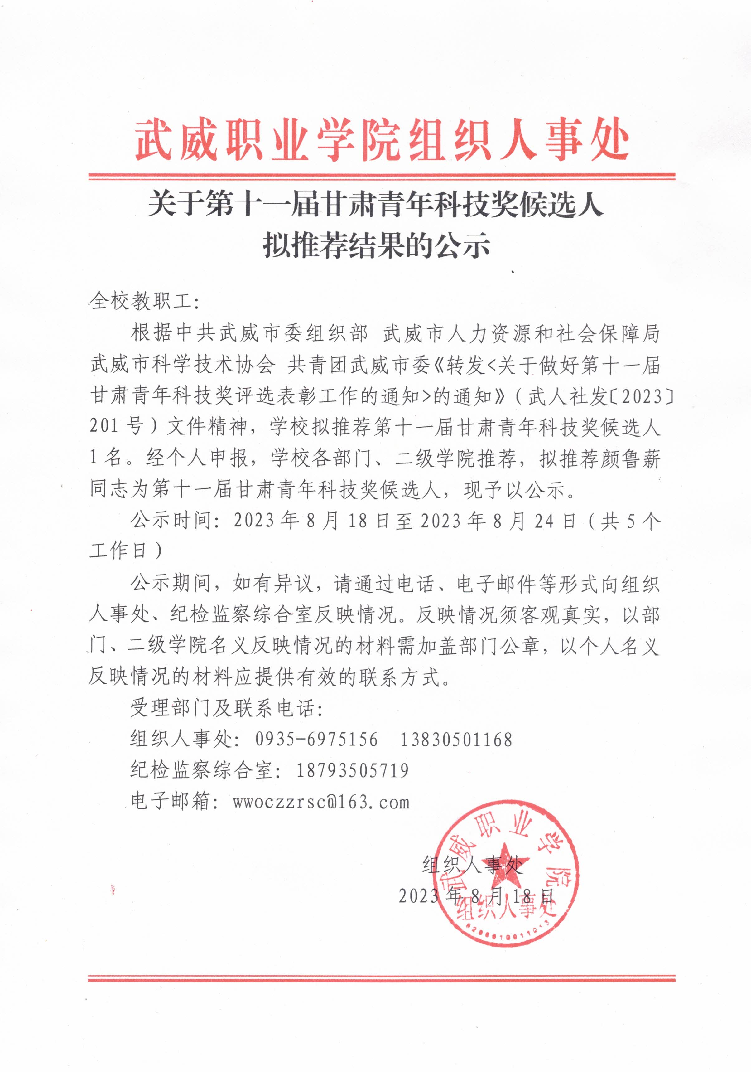 關(guān)于第十一屆甘肅青年科技獎(jiǎng)候選人擬推薦結(jié)果的公示