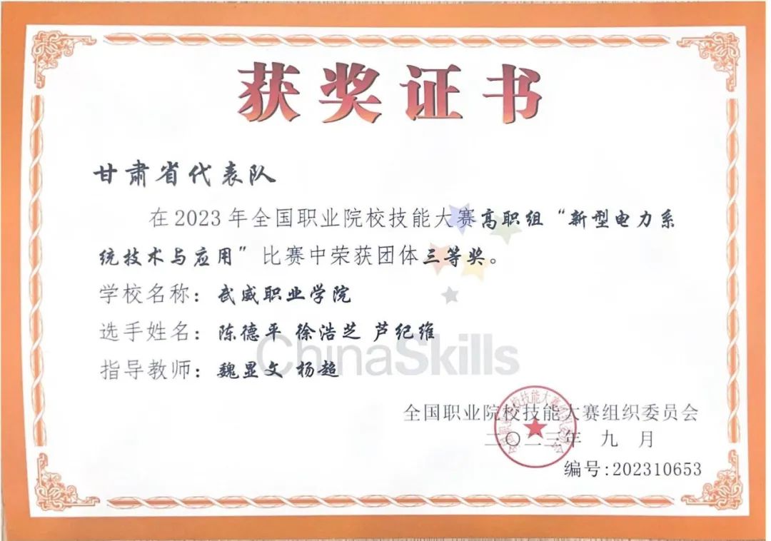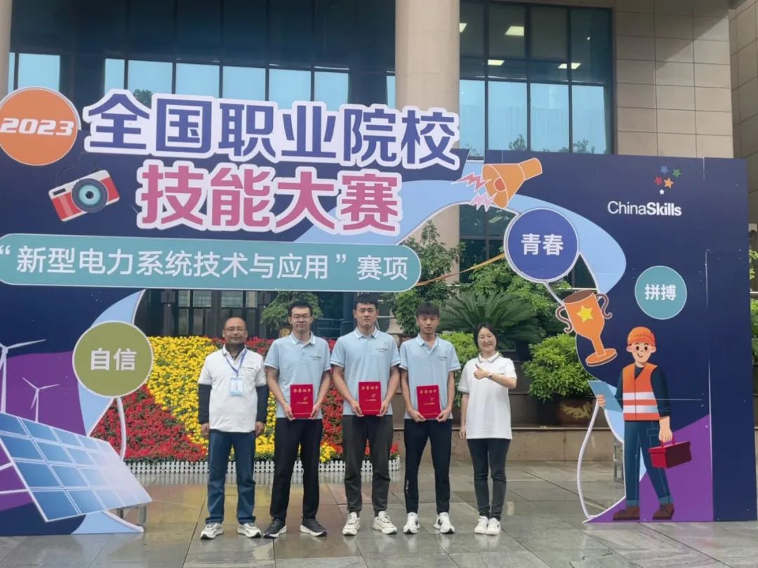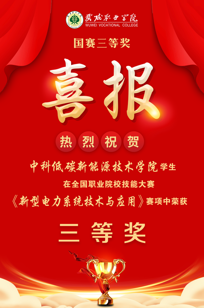 在2023年全國(guó)職業(yè)院校技能大賽中中科低碳新能源技術(shù)學(xué)院學(xué)生陳德平、徐浩芝、蘆紀(jì)維獲得高職組新型電力系統(tǒng)技術(shù)與應(yīng)用賽項(xiàng)團(tuán)體三等獎(jiǎng)。