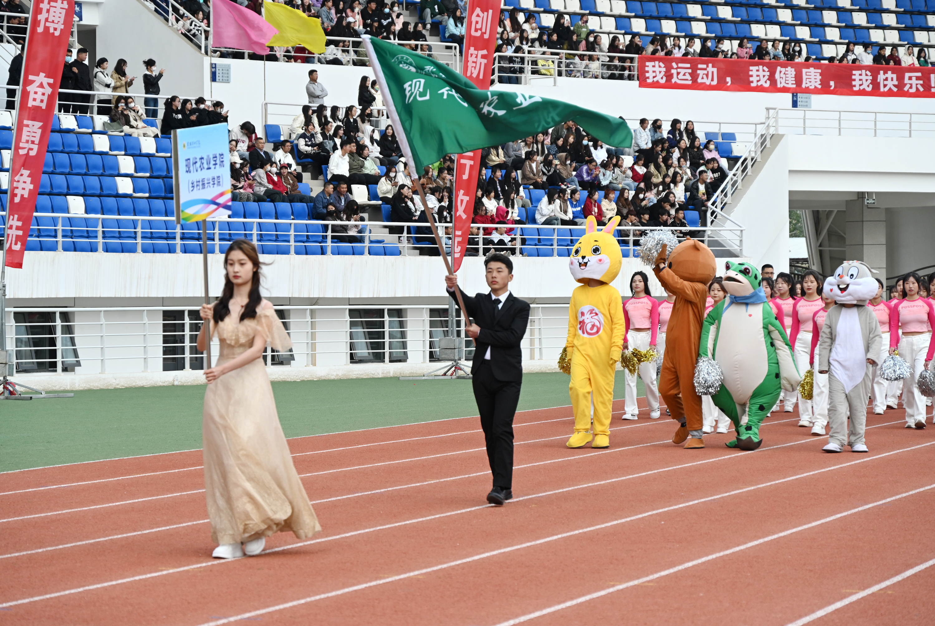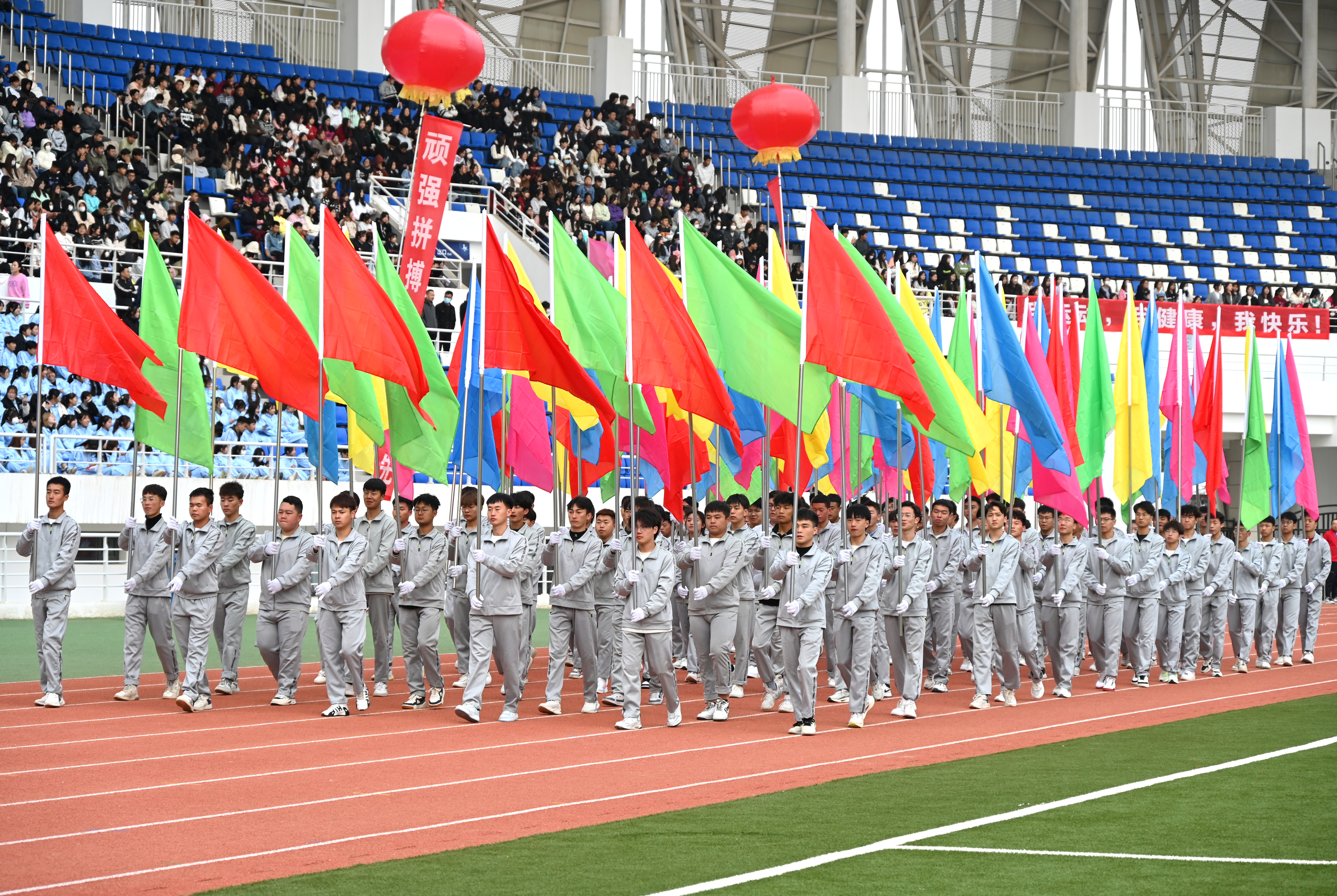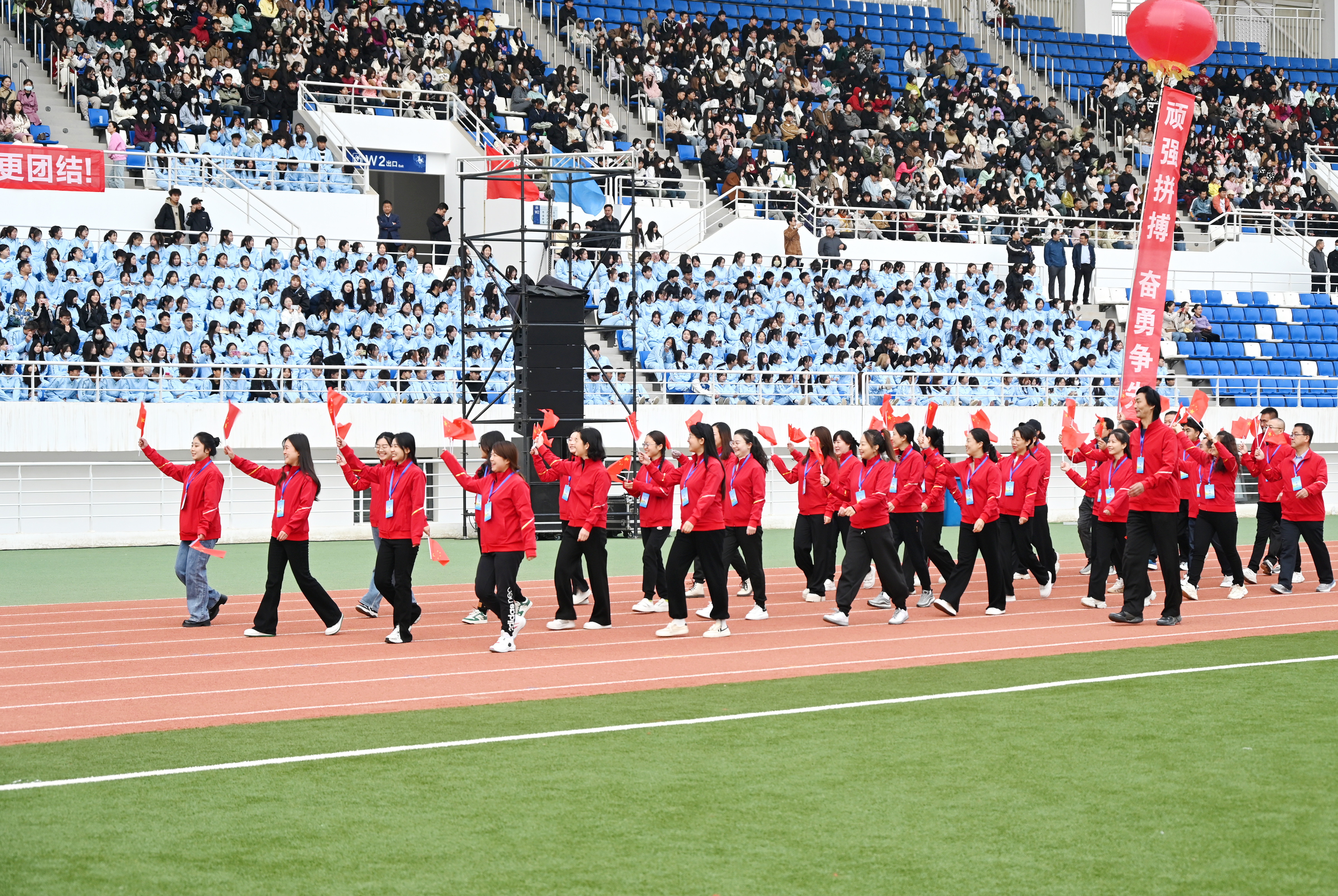 伴隨著雄壯激越的運(yùn)動(dòng)員進(jìn)行曲,國(guó)旗護(hù)衛(wèi)隊(duì)、彩旗隊(duì)、裁判員隊(duì)伍、各二級(jí)學(xué)院方陣依次入場(chǎng),隊(duì)列步伐整齊有力,口號(hào)堅(jiān)定嘹亮,充分展示了師生良好的精神風(fēng)貌。