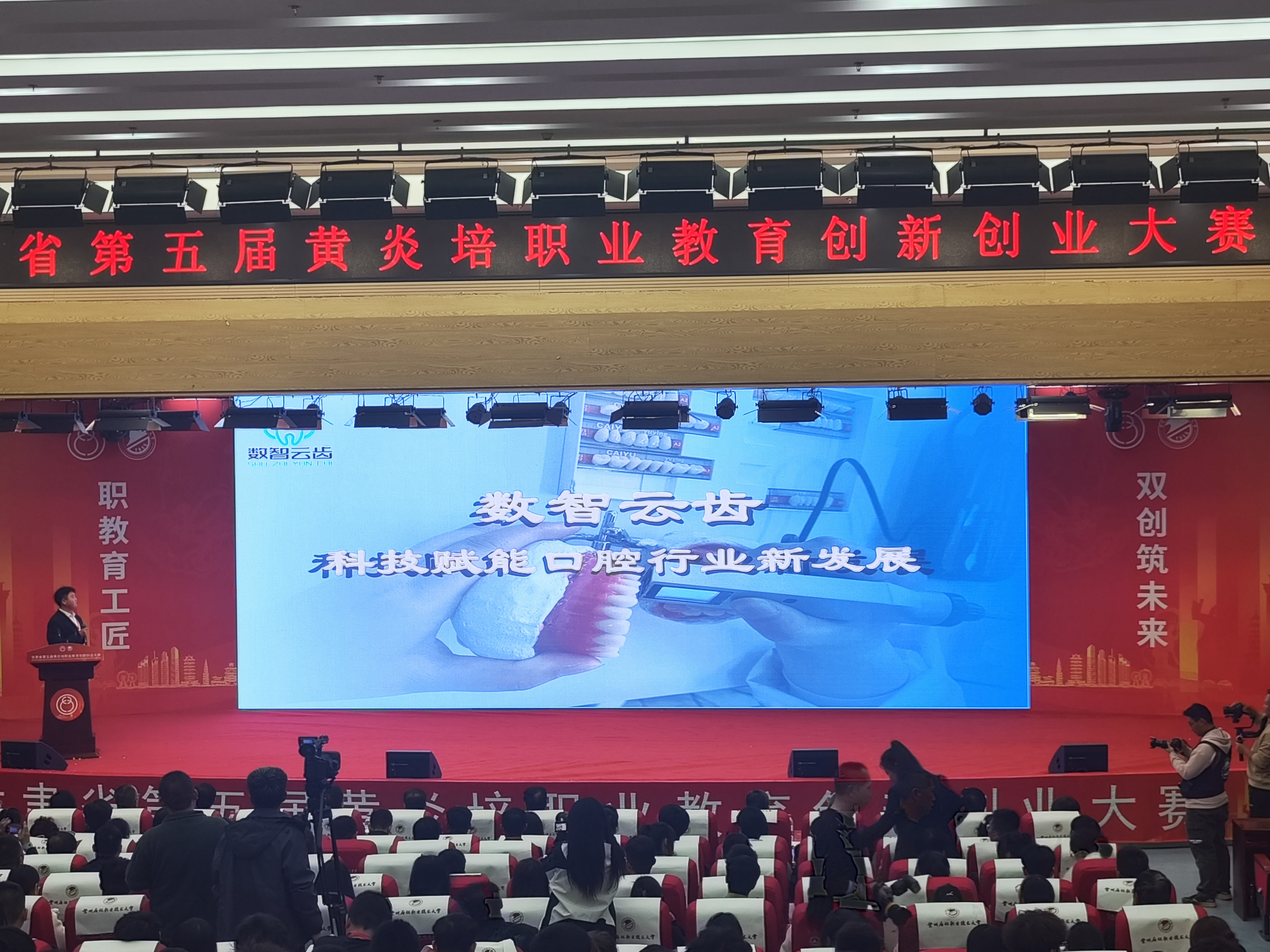 本屆大賽以“職教育工匠,雙創(chuàng)筑未來”為主題,設(shè)主題賽和專項(xiàng)賽,省內(nèi)47所院校近300名選手參加決賽,經(jīng)過激烈角逐,我校獲一等獎1項(xiàng),三等獎4項(xiàng),學(xué)校榮獲優(yōu)秀組織獎?!稊?shù)智云齒--科技賦能口腔行業(yè)新發(fā)展》項(xiàng)目在頒獎晚會代表優(yōu)秀項(xiàng)目進(jìn)行路演。
