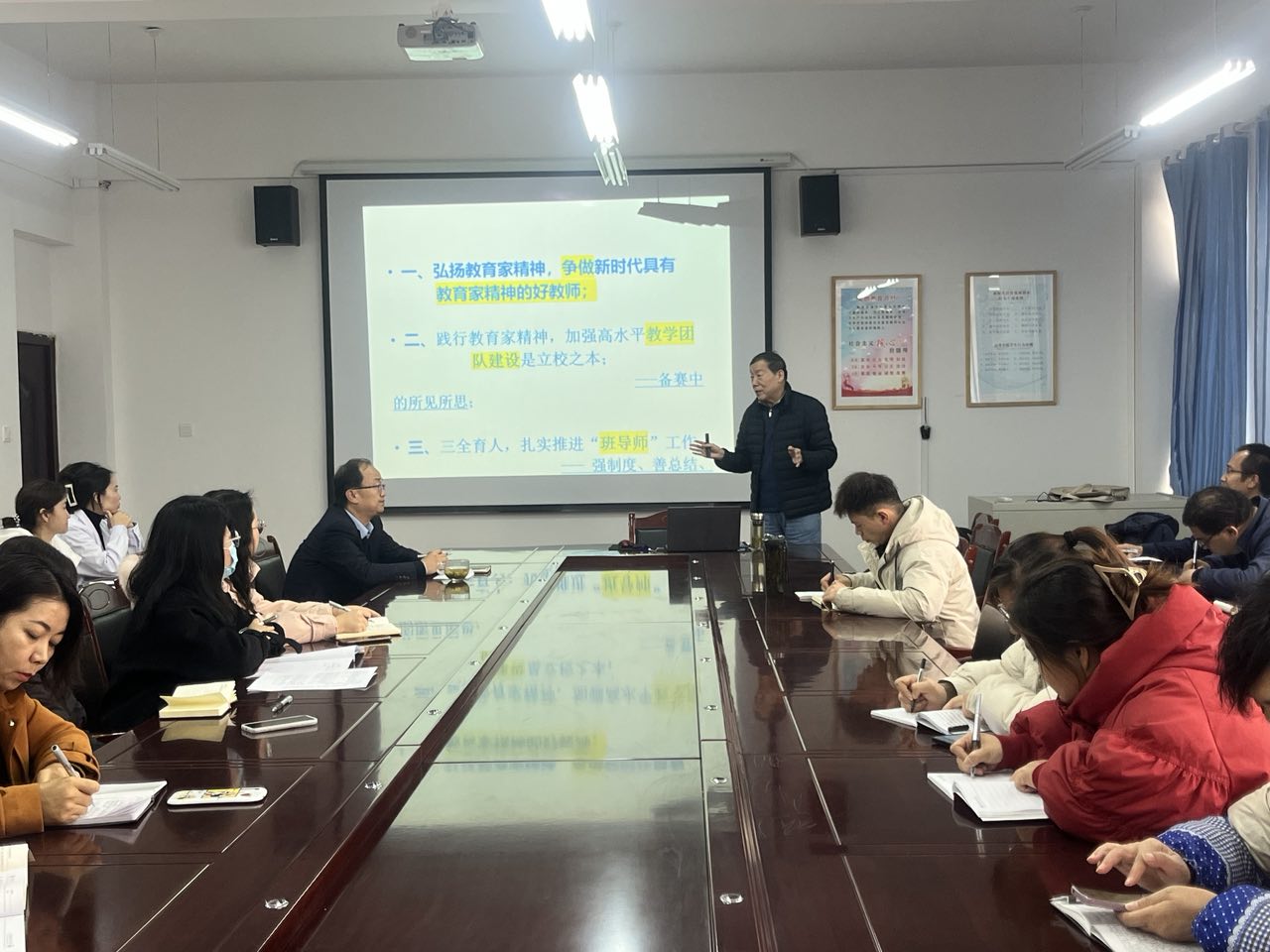 楊存忠教授主要從“弘揚(yáng)教育家精神,爭(zhēng)做新時(shí)代具有教育家精神的好老師”、“踐行教育家精神,加強(qiáng)高水平教學(xué)團(tuán)隊(duì)建設(shè)”、“三全育人,扎實(shí)推進(jìn)班導(dǎo)師工作”以及“如何上好一堂課”四部分展開(kāi)。楊存忠教授解讀了中國(guó)特有教育家精神的內(nèi)涵;闡述了堅(jiān)持師德師風(fēng)第一標(biāo)準(zhǔn),大力弘揚(yáng)教育家精神的重要意義和基本要求;結(jié)合典型案例,以案為戒,勉勵(lì)新時(shí)代教師既精通專業(yè)知識(shí)、做好“經(jīng)師”,又涵養(yǎng)德行、成為“人師”,努力做精于傳道授業(yè)解惑的“經(jīng)師”和“人師”的統(tǒng)一者。楊存忠教授還就如何上好一堂課與老師們進(jìn)行了深入交流。