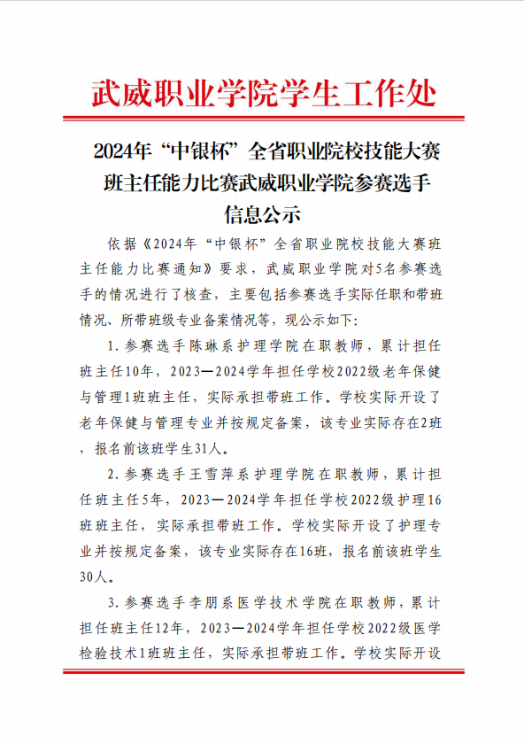 2024年“中銀杯”全省職業(yè)院校技能大賽班主任能力比賽武威職業(yè)學院參賽選手信息公示