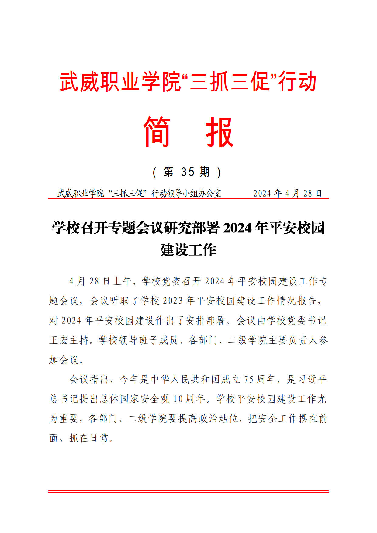 簡報第35期:學(xué)校召開專題會議研究部署2024年平安校園建設(shè)工作
