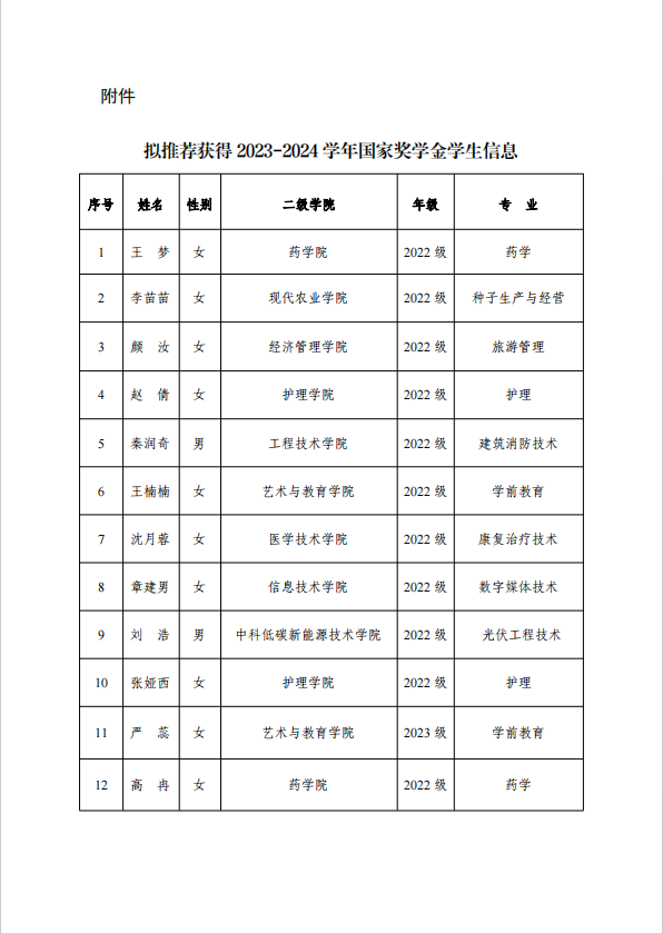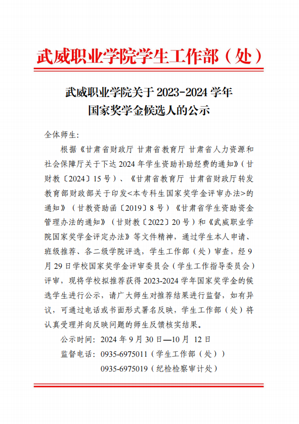 武威職業(yè)學(xué)院關(guān)于2023-2024學(xué)年國家獎學(xué)金候選人的公示