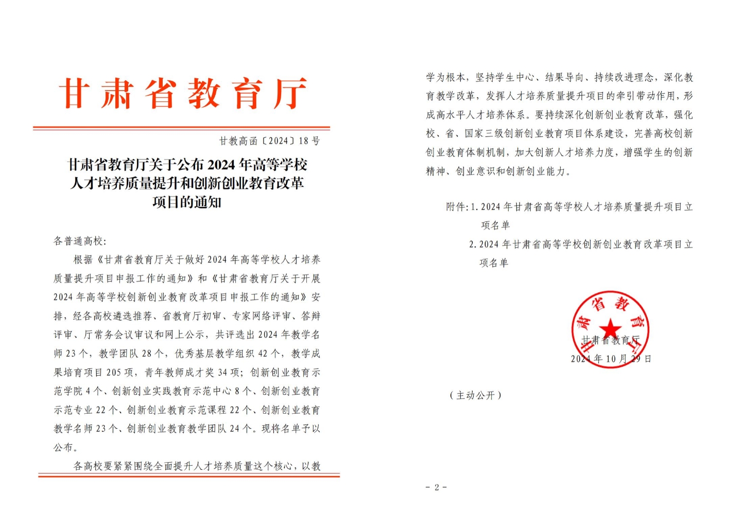創(chuàng)新創(chuàng)業(yè)教育改革項(xiàng)目是為深入貫徹落實(shí)《國務(wù)院辦公廳關(guān)于進(jìn)一步支持大學(xué)生創(chuàng)新創(chuàng)業(yè)的指導(dǎo)意見》(國辦發(fā)〔2021〕35 號)、《甘肅省教育廳等十三部門印發(fā)〈甘肅省關(guān)于進(jìn)一步支持大學(xué)生創(chuàng)新創(chuàng)業(yè)的若干措施〉的通知》(甘教高〔2022〕3 號)等精神,推動全省高等學(xué)校持續(xù)深化創(chuàng)新創(chuàng)業(yè)教育改革,主動融入產(chǎn)業(yè)轉(zhuǎn)型升級和創(chuàng)新驅(qū)動發(fā)展戰(zhàn)略,提高人才培養(yǎng)質(zhì)量的重要舉措。本次認(rèn)定的4項(xiàng)創(chuàng)新創(chuàng)業(yè)教育改革項(xiàng)目,是對我校創(chuàng)新創(chuàng)業(yè)工作的肯定,也對學(xué)校高質(zhì)量發(fā)展,提升人才培養(yǎng)質(zhì)量具有重要的推動作用。