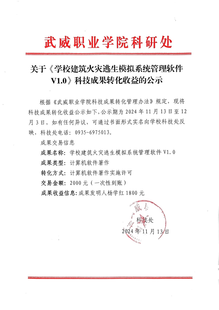 關(guān)于《學(xué)校建筑火災(zāi)逃生模擬系統(tǒng)管理軟件V1.0》科技成果轉(zhuǎn)化收益的公示
