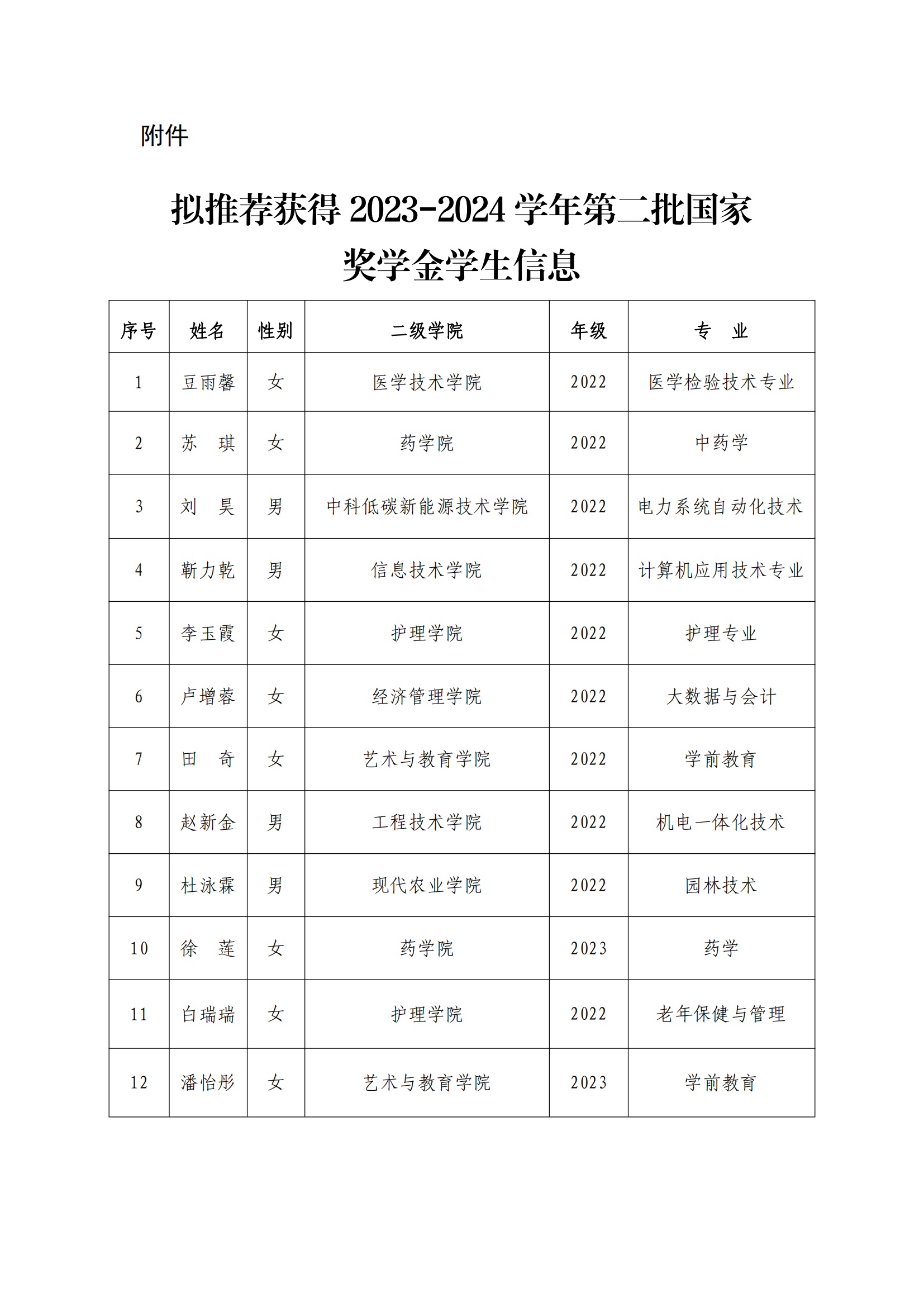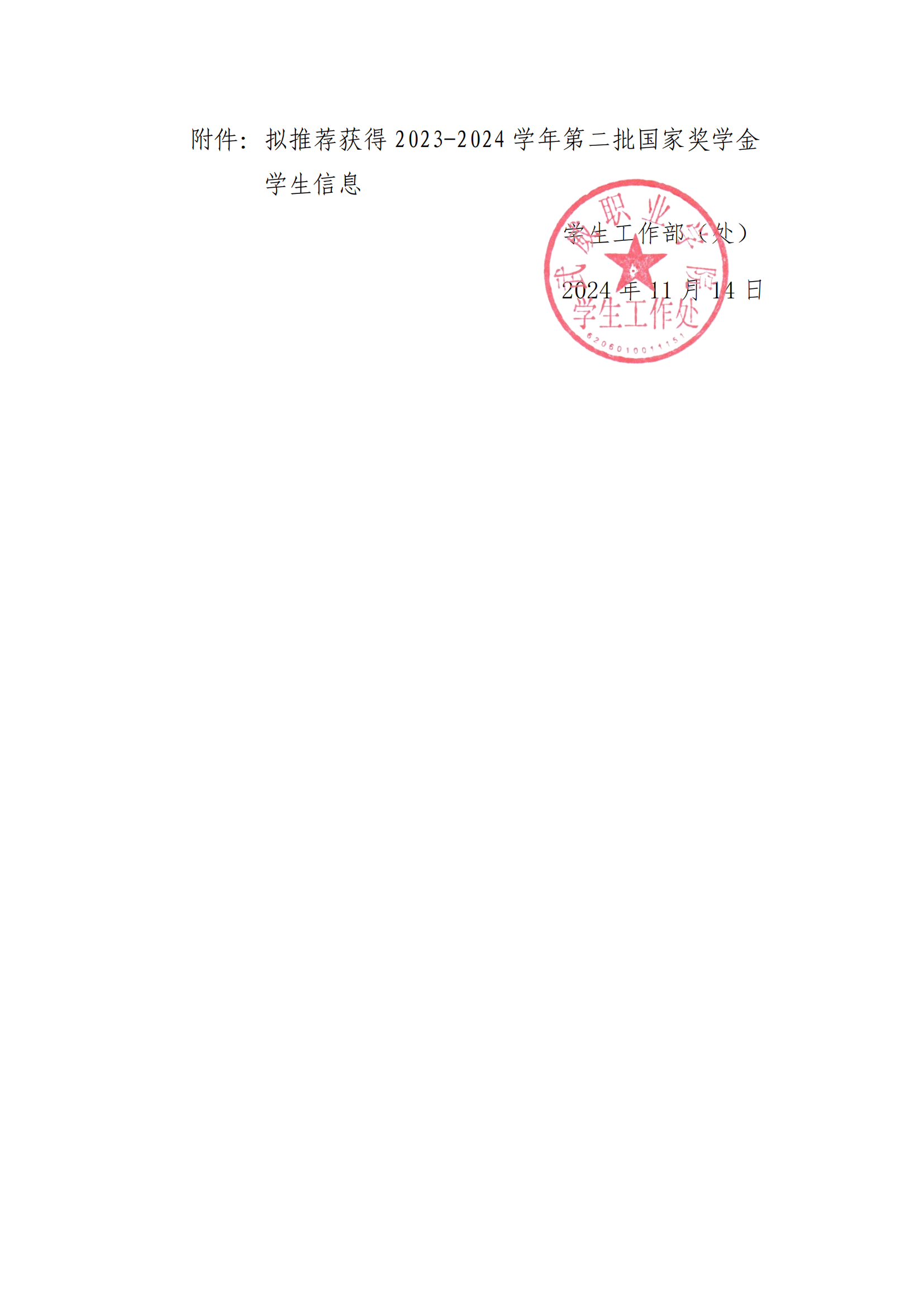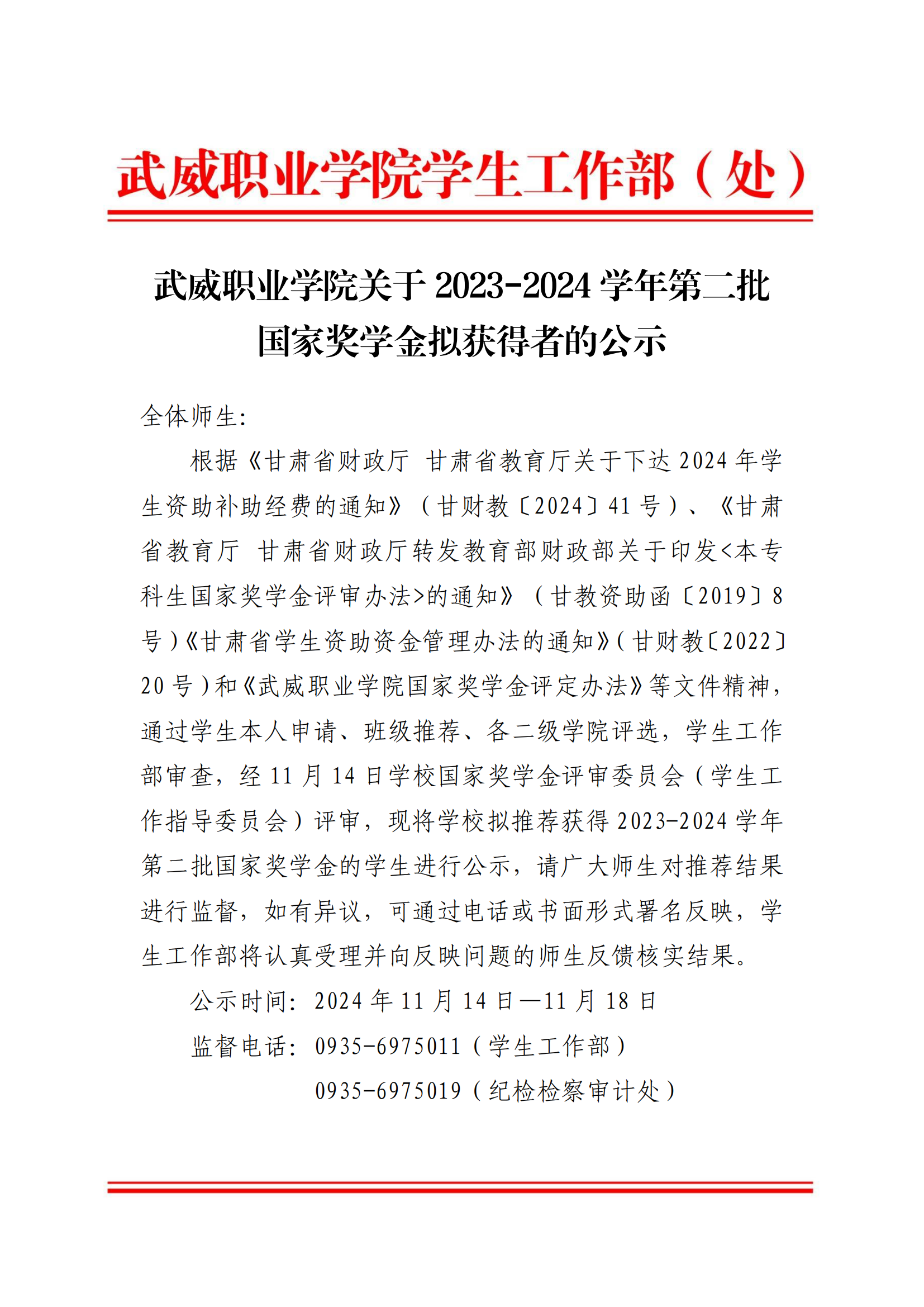 武威職業(yè)學(xué)院關(guān)于2023-2024學(xué)年第二批國(guó)家獎(jiǎng)學(xué)金擬獲得者的公示