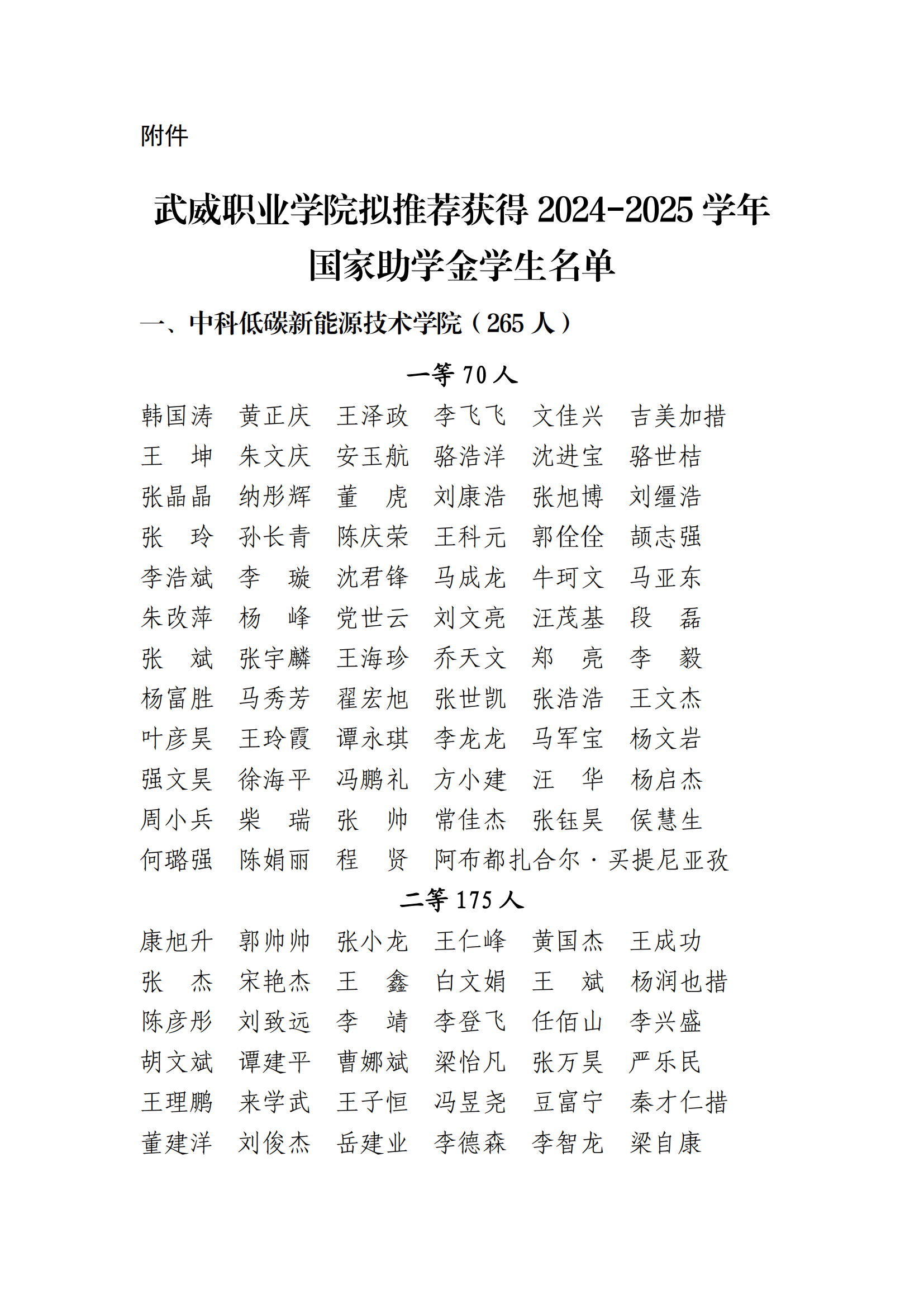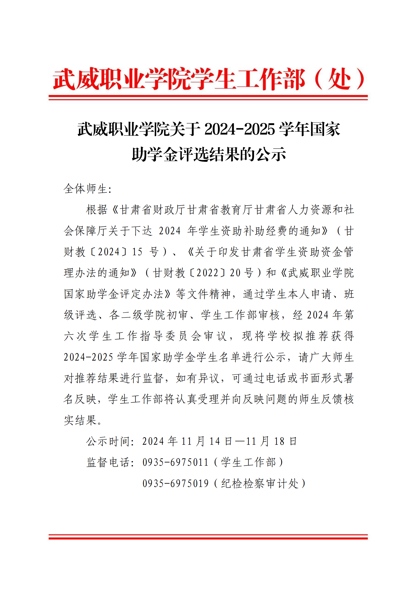 武威職業(yè)學(xué)院關(guān)于2024-2025學(xué)年國家助學(xué)金評選結(jié)果的公示