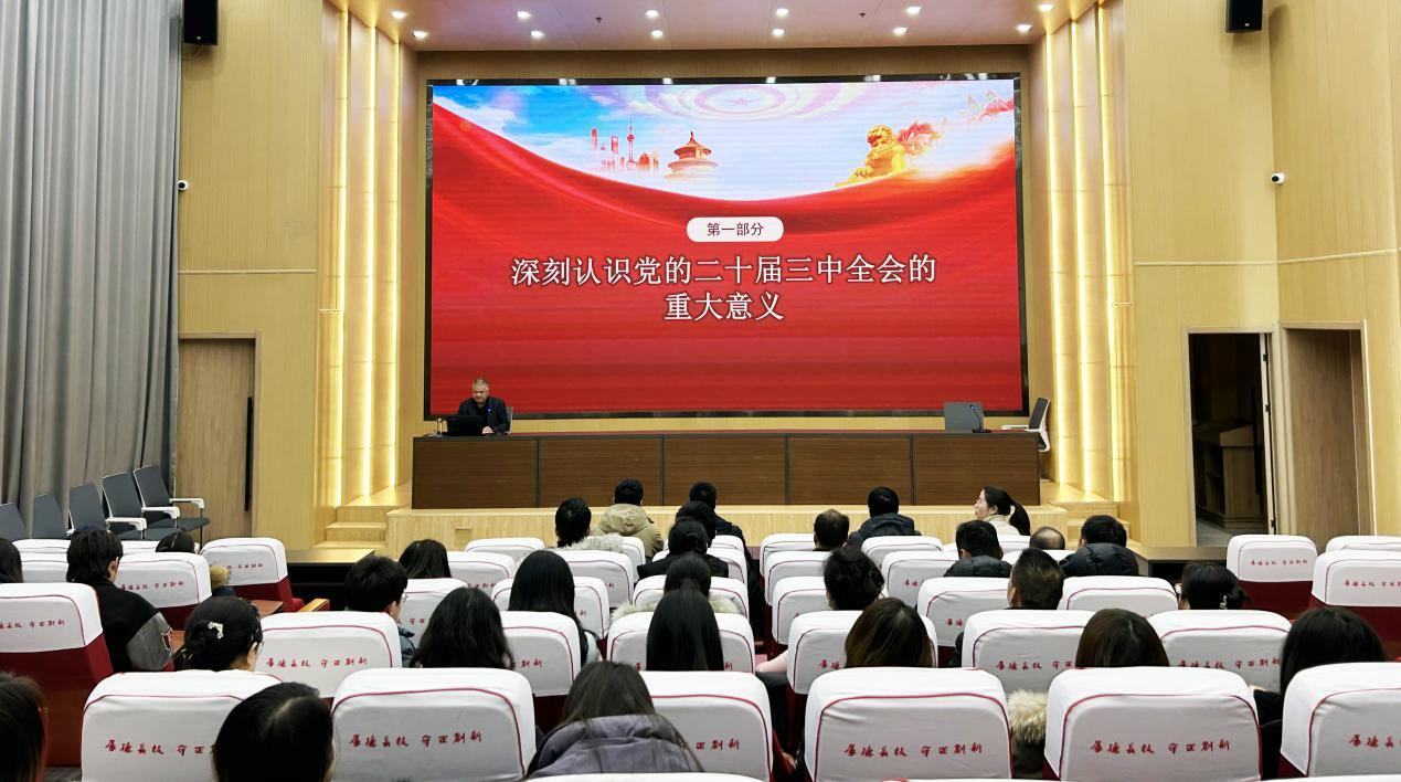 1月3日下午,黨委委員、副校長王守云在能源科技樓學(xué)術(shù)報(bào)告廳為藝術(shù)與教育學(xué)院、經(jīng)濟(jì)管理學(xué)院師生帶來了一場生動(dòng)而有深度的專題黨課報(bào)告會(huì),深入解讀黨的二十屆三中全會(huì)精神和習(xí)近平總書記視察甘肅重要講話重要指示精神。兩學(xué)院黨員、預(yù)備黨員、入黨積極分子、師生代表共100余人參加。