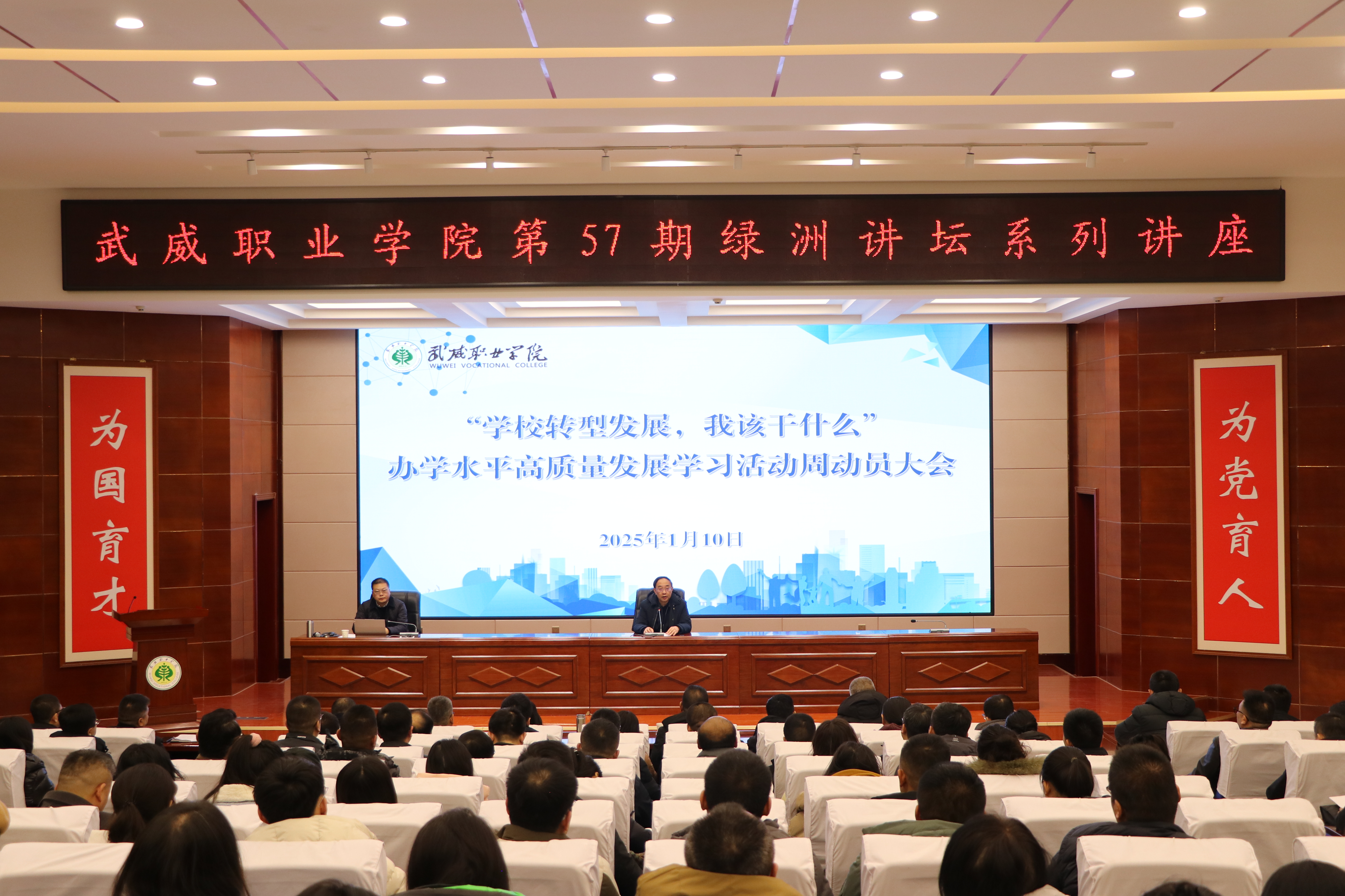 1月10日下午,學(xué)校第五十七期綠洲講壇暨辦學(xué)水平高質(zhì)量發(fā)展學(xué)習(xí)活動周動員大會在菁英廳順利啟動,學(xué)校領(lǐng)導(dǎo)、中層管理干部、教研室主任及教師代表共210余人參加了活動。黨委副書記翟存祥主持活動。