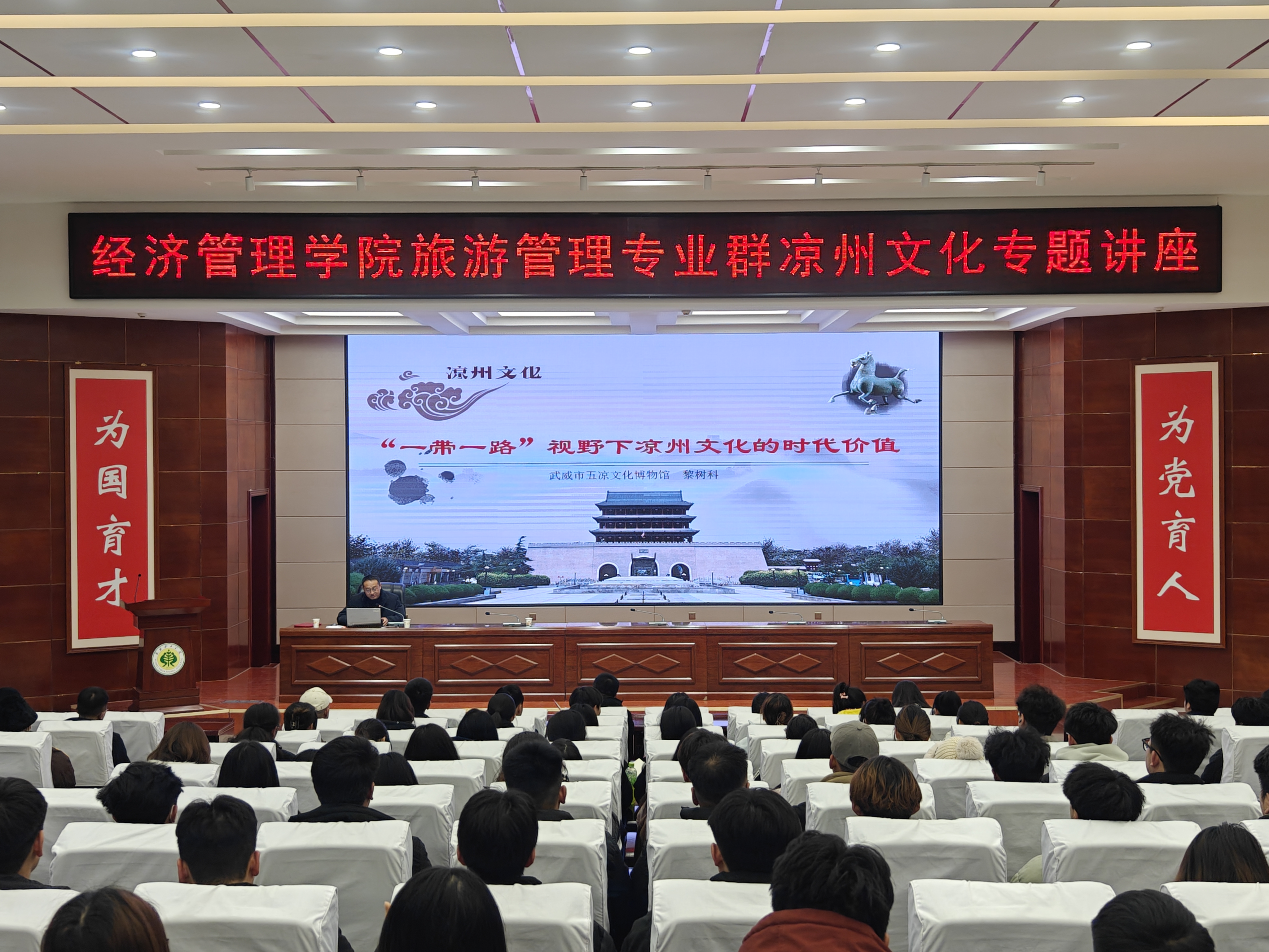 12月11日下午,經(jīng)濟管理學院邀請武威市五涼文化博物館館長黎樹科開展了以《“一帶一路” 視野下涼州文化的時代價值》為主題的講座,旨在深入貫徹文化傳承發(fā)展戰(zhàn)略,加強傳統(tǒng)文化的弘揚與教育。學院近200名師生參加此次講座。