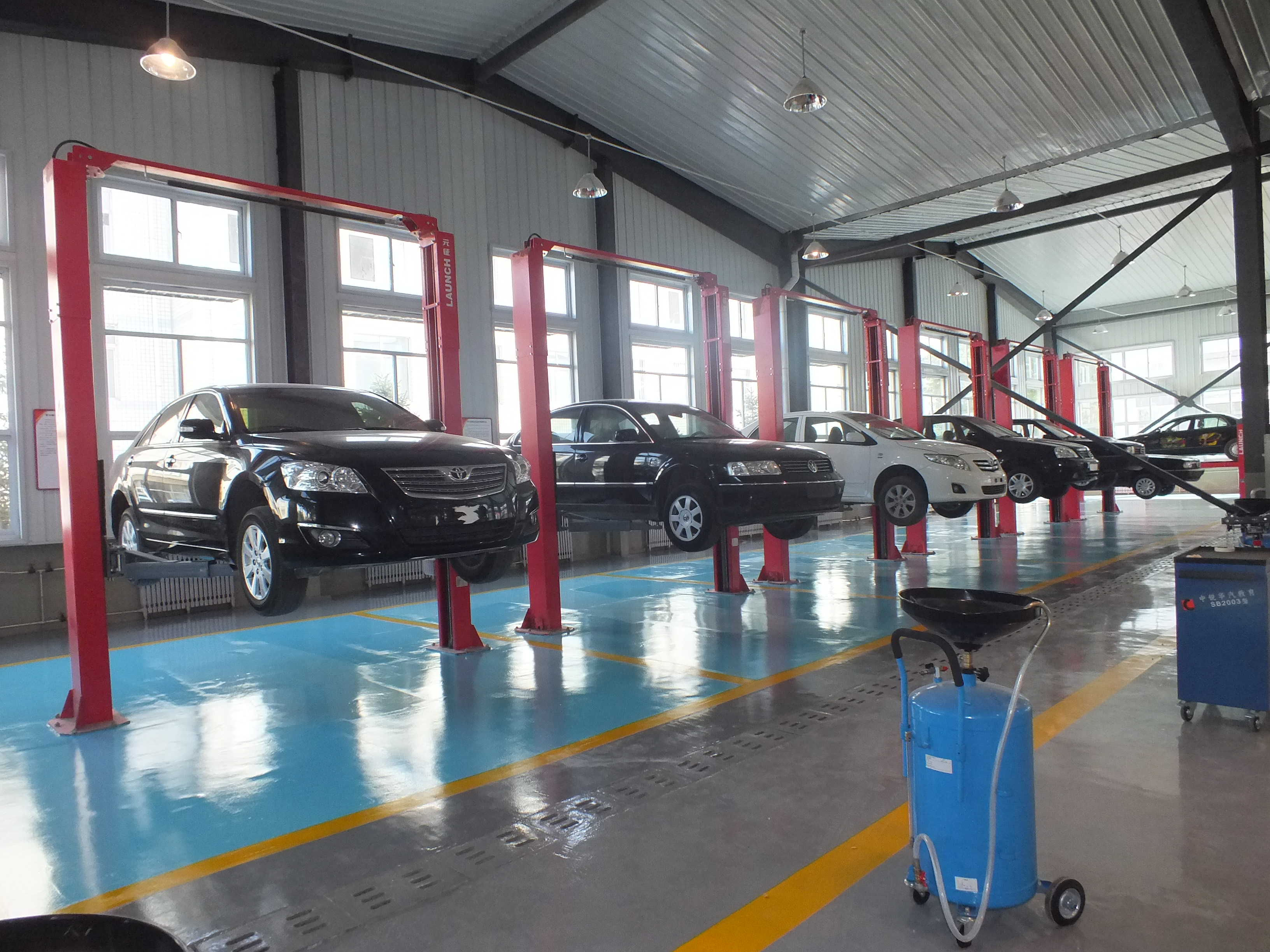 有教學車輛14臺,包括大眾、豐田、通用等汽車行業(yè)知名品牌。雙柱式舉升機6臺,四柱式舉升機1臺,用于汽車維護、汽車保養(yǎng)、汽車修理等教學生產工作,為學生的汽車維修事業(yè)打好基礎。