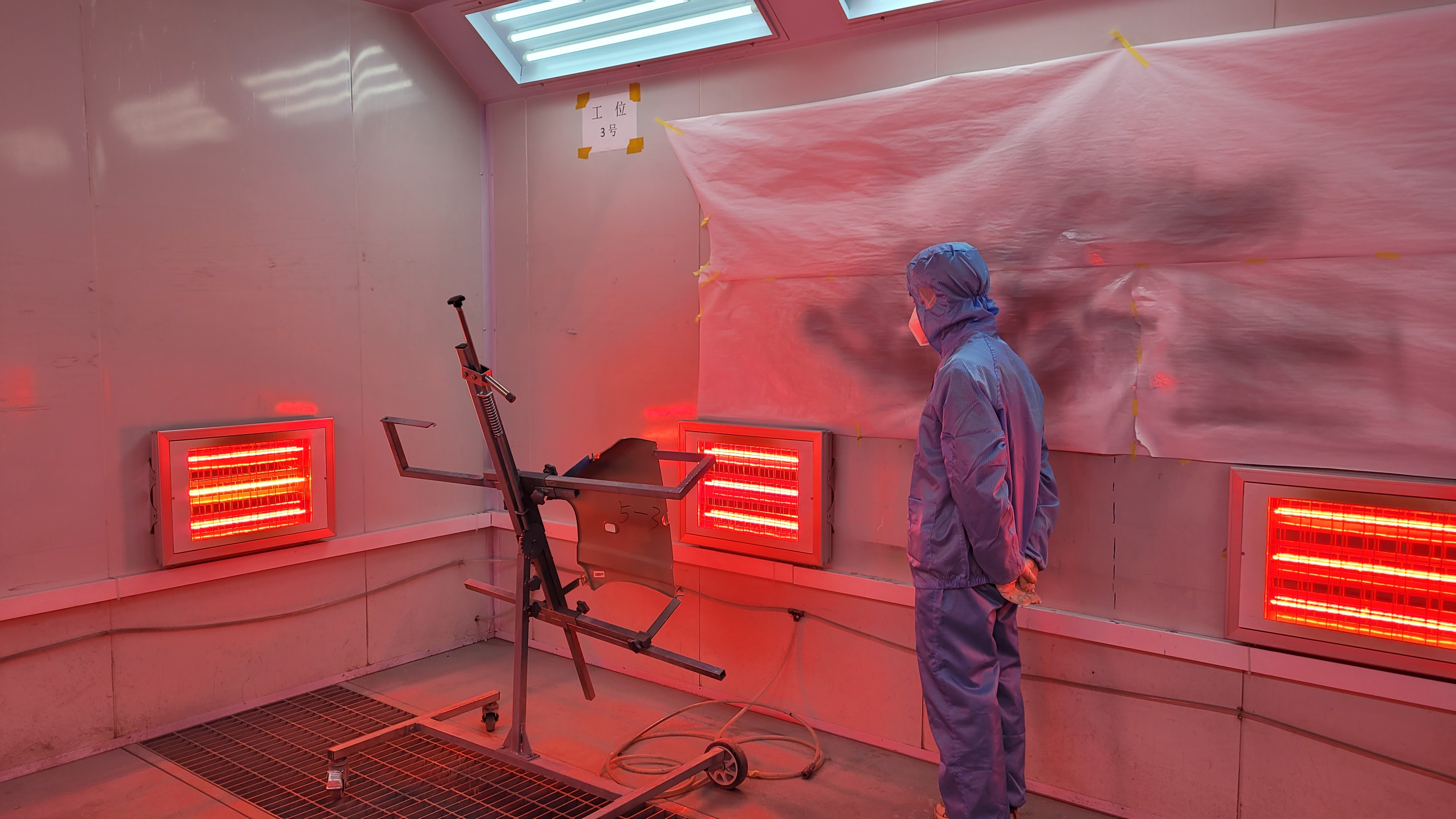 此實訓室是兼鈑金、噴涂于一體的實訓室,內配有噴漆房、噴漆機、噴漆槍、普通和高性能噴漆、烘干箱、鈑金工作臺等,學生可以在真實且安全的壞境下練習和應用鈑噴技術,包括車身修補、涂裝物表面處理、烘干和噴漆圖層的評估等,是實訓中心必要的設施之一。