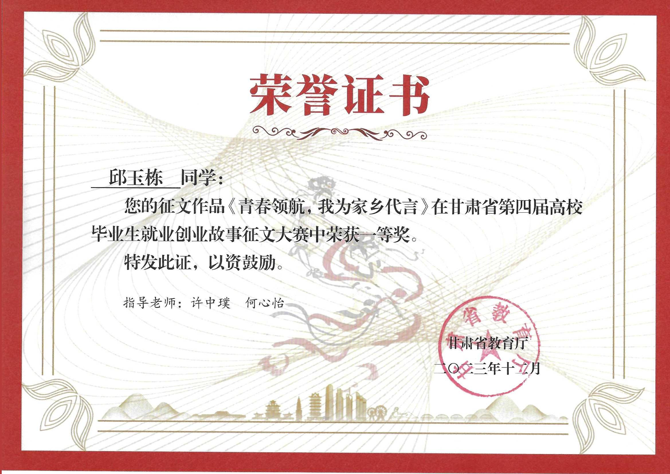 2023年學(xué)生在甘肅省第四屆高校畢業(yè)生就業(yè)創(chuàng)業(yè)故事征文大賽獲一等獎