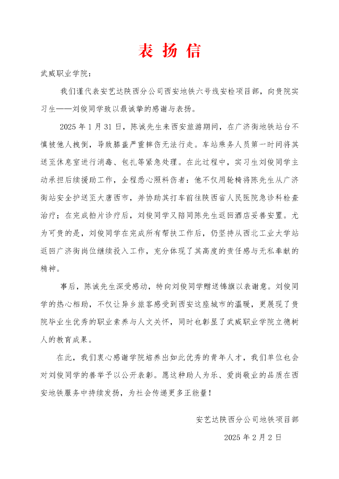 近日,武威職業(yè)學(xué)院計算機(jī)應(yīng)用技術(shù)專業(yè)2025屆畢業(yè)生劉俊在西安地鐵實習(xí)期間,主動救助因突發(fā)意外受傷的乘客,展現(xiàn)了當(dāng)代青年學(xué)子的責(zé)任擔(dān)當(dāng)。其事跡獲得被救助乘客及實習(xí)單位的高度評價,乘客陳先生向劉俊同學(xué)贈送錦旗以表謝意,實習(xí)單位安藝達(dá)陜西分公司地鐵項目部特向?qū)W校發(fā)來表揚(yáng)信,稱贊其“以行動詮釋服務(wù)精神,用愛心彰顯職業(yè)素養(yǎng)”。