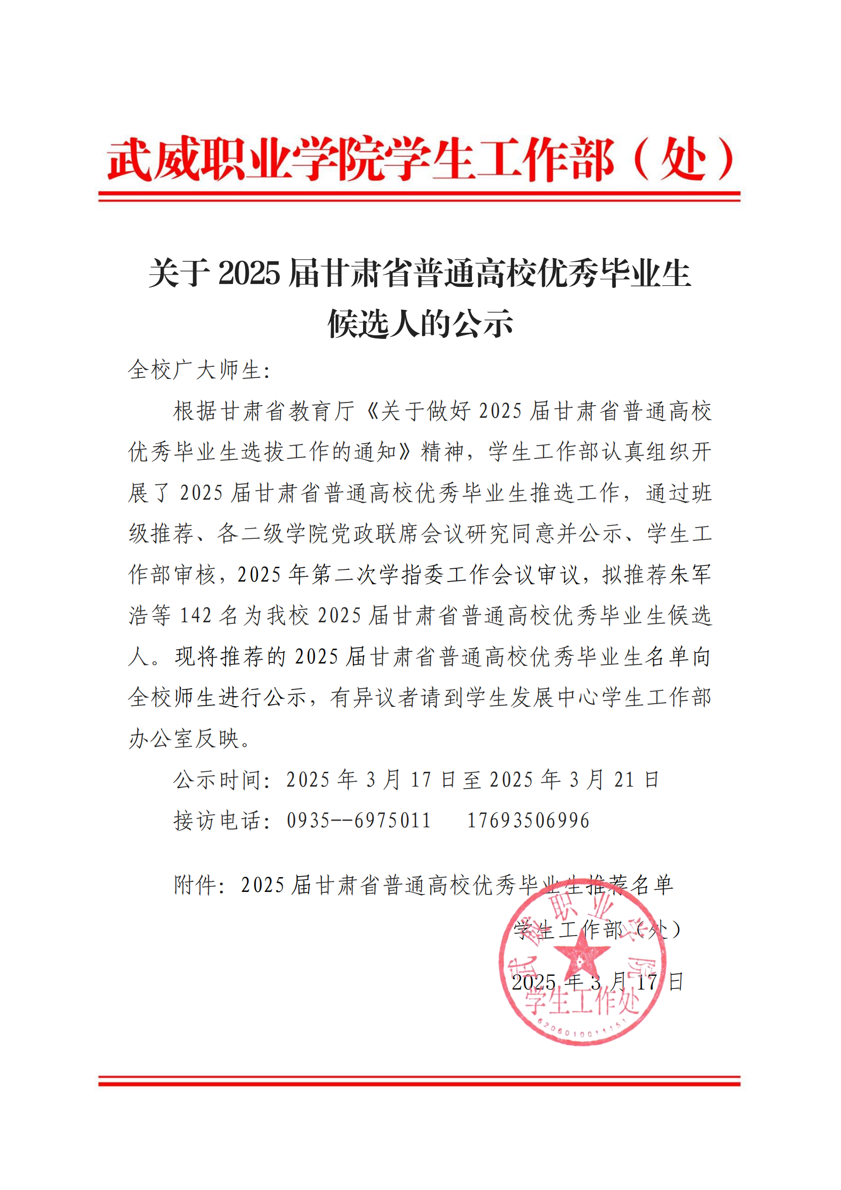 關(guān)于2025屆武威職業(yè)學院優(yōu)秀畢業(yè)生候選人的公示