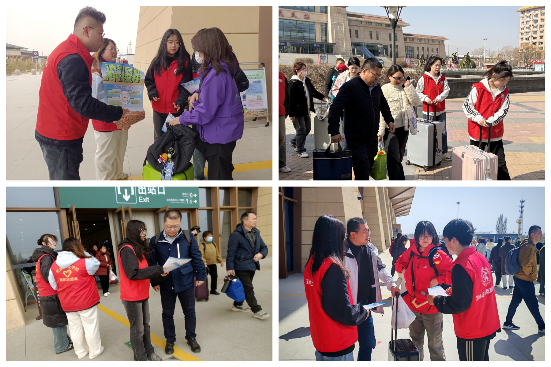 助力“請到民勤種棵樹”活動。宣傳統(tǒng)戰(zhàn)部、校團委組織志愿者在武威高鐵站、火車站、客運中心設立志愿服務站,為前來參加“請到民勤種棵樹”活動的志愿者們提供引導服務,詳細告知前往民勤的乘車路線、換乘信息和注意事項,協(xié)助搬運行李,引導他們有序乘車。