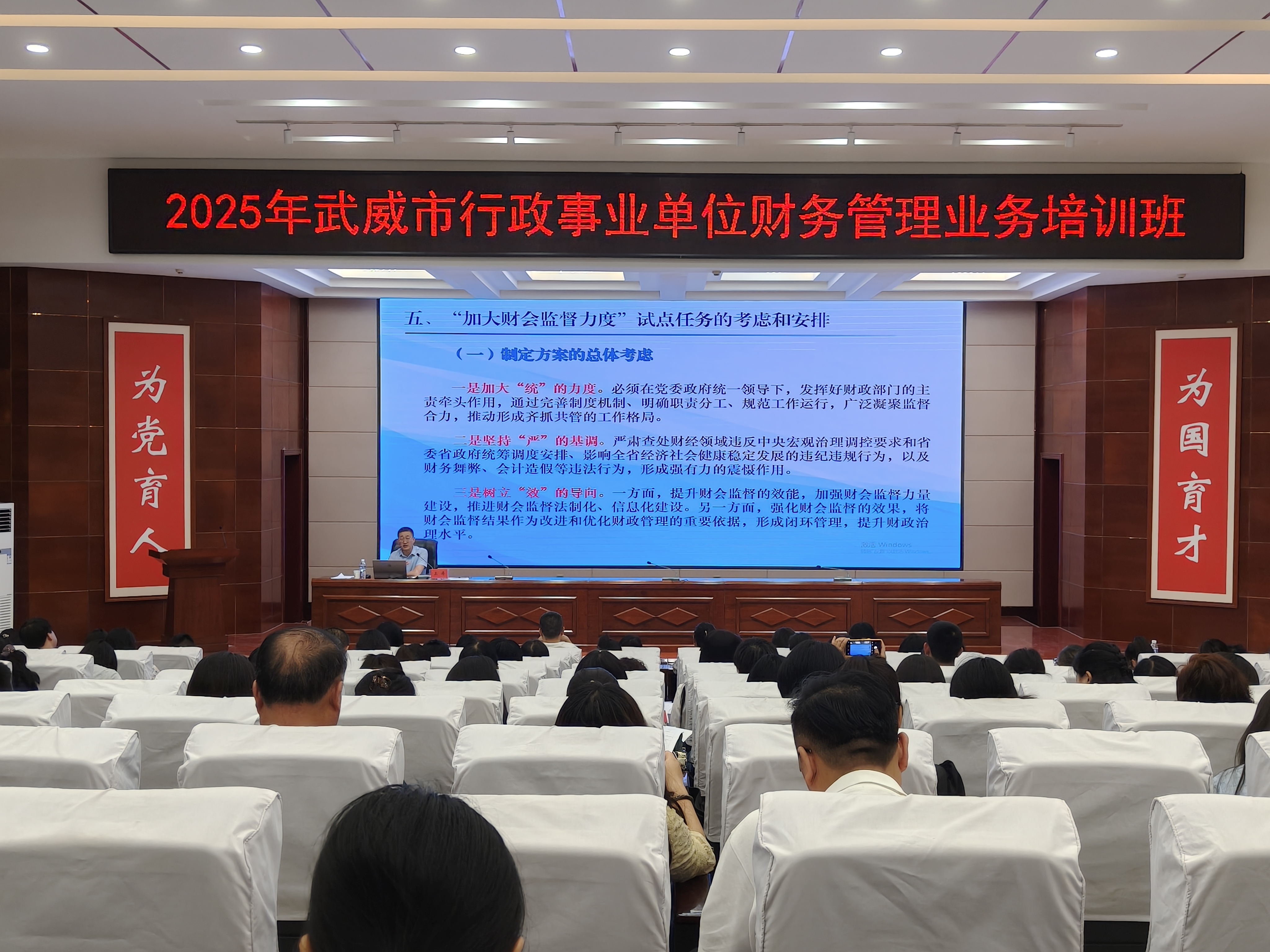 為深入貫徹實施新《會計法》,進一步做好2025年全市行政事業(yè)單位財會人員素質(zhì)提升和崗位能力培訓工作,根據(jù)市財政局局黨組年初工作安排,6月11日-12日,由武威市財政局主辦,學校承辦的全市行政事業(yè)單位財務管理業(yè)務培訓班在菁英廳順利舉行。全市行政事業(yè)單位財務業(yè)務骨干及業(yè)務人員共180余人參加了培訓。