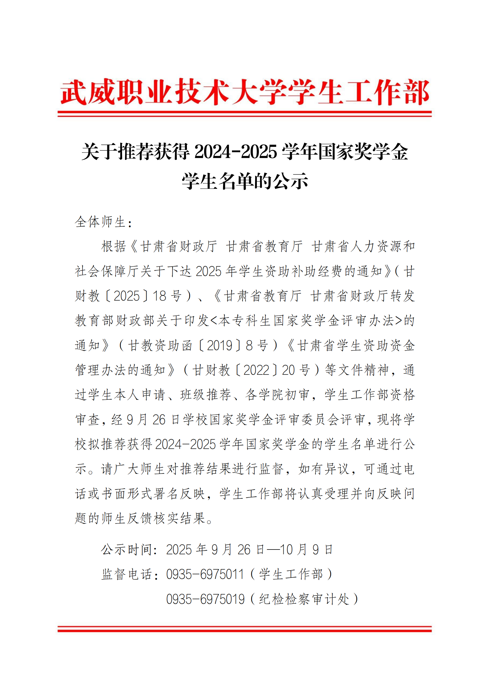 甘肅省武威師范學(xué)校關(guān)于2025-2026學(xué)年國家助學(xué)金評(píng)選結(jié)果的公示