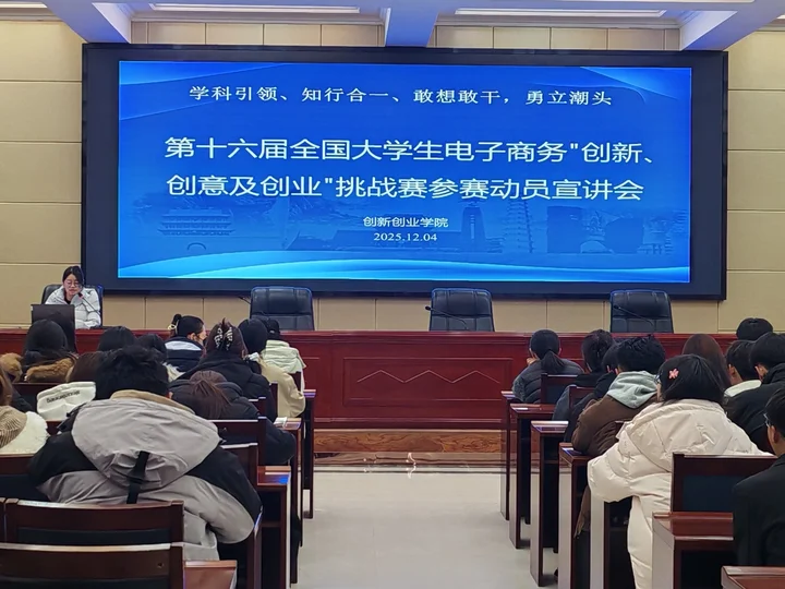 為積極備戰(zhàn)第十六屆全國大學生電子商務“創(chuàng)新、創(chuàng)意及創(chuàng)業(yè)”挑戰(zhàn)賽,激發(fā)學生參賽熱情,提升項目質量,創(chuàng)新創(chuàng)業(yè)學院于12月4日在行樹樓北側報告廳舉行大賽動員宣講會。來自全校9個學院的師生代表共計120人參加了本次動員會。