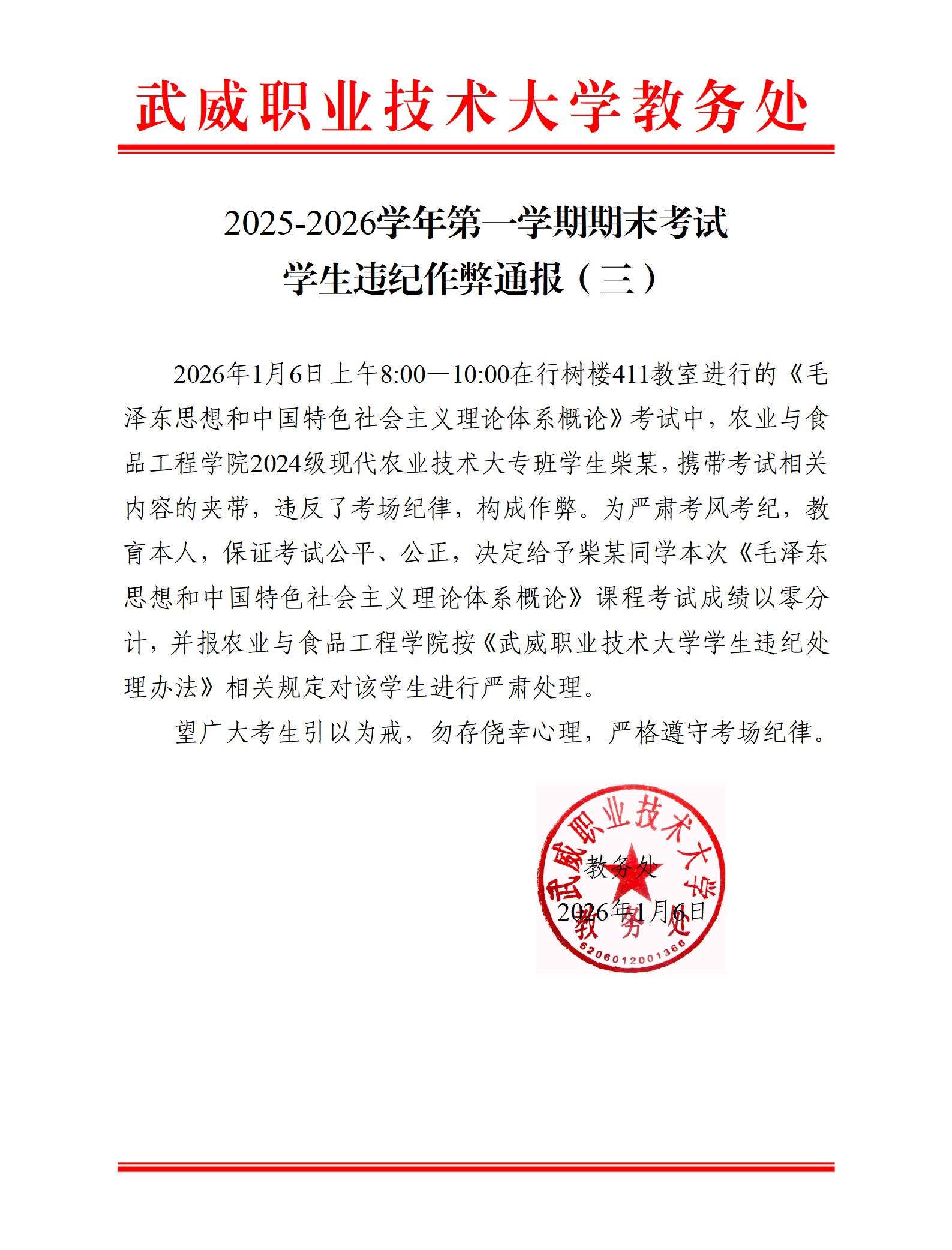 2025-2026學(xué)年第一學(xué)期期末考試學(xué)生違紀(jì)作弊通報(六)