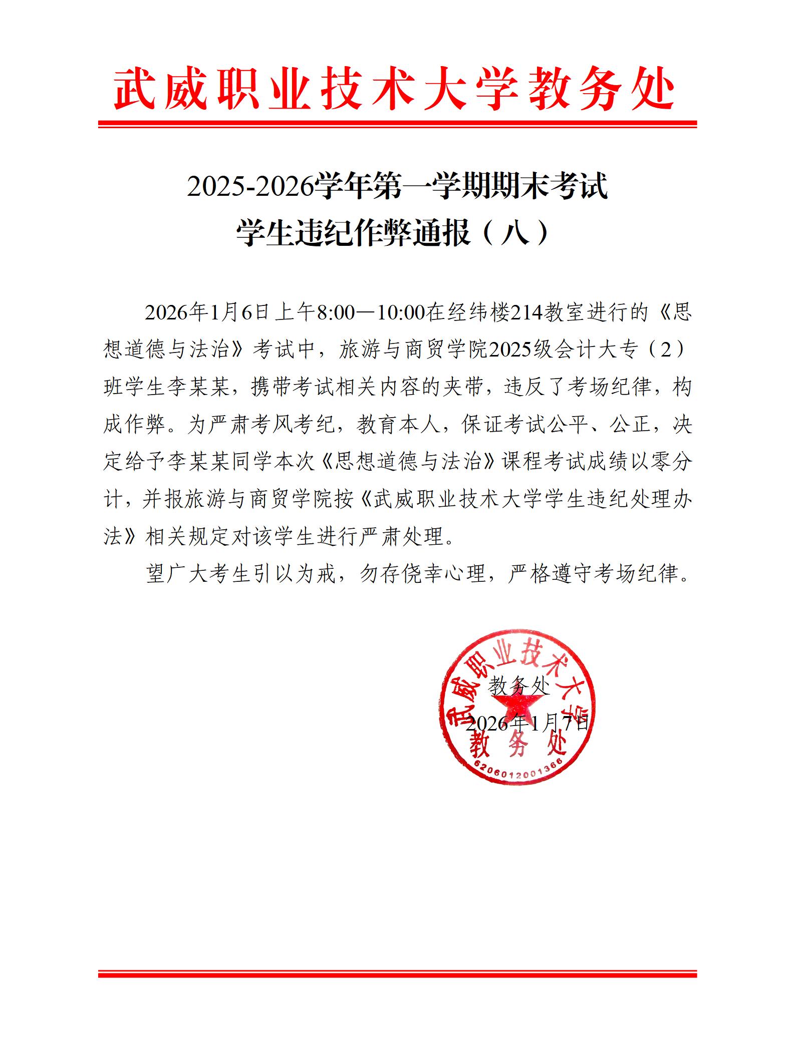 2025-2026學(xué)年第一學(xué)期期末考試學(xué)生違紀(jì)作弊通報(bào)(八)