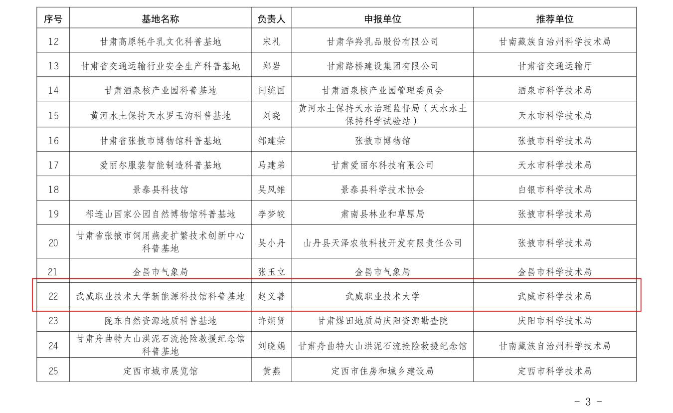 為深入貫徹國家創(chuàng)新驅(qū)動(dòng)發(fā)展戰(zhàn)略,服務(wù)“雙碳”目標(biāo),由武威職業(yè)技術(shù)大學(xué)中科低碳新能源技術(shù)學(xué)院作為主體單位申報(bào)、學(xué)??萍继幏e極引導(dǎo)和扶持科普能力建設(shè)的甘肅省“武威職業(yè)技術(shù)大學(xué)新能源科技館科普基地”成功獲批,標(biāo)志著我校在新能源科普教育、科研創(chuàng)新與社會(huì)服務(wù)方面邁上新臺(tái)階。