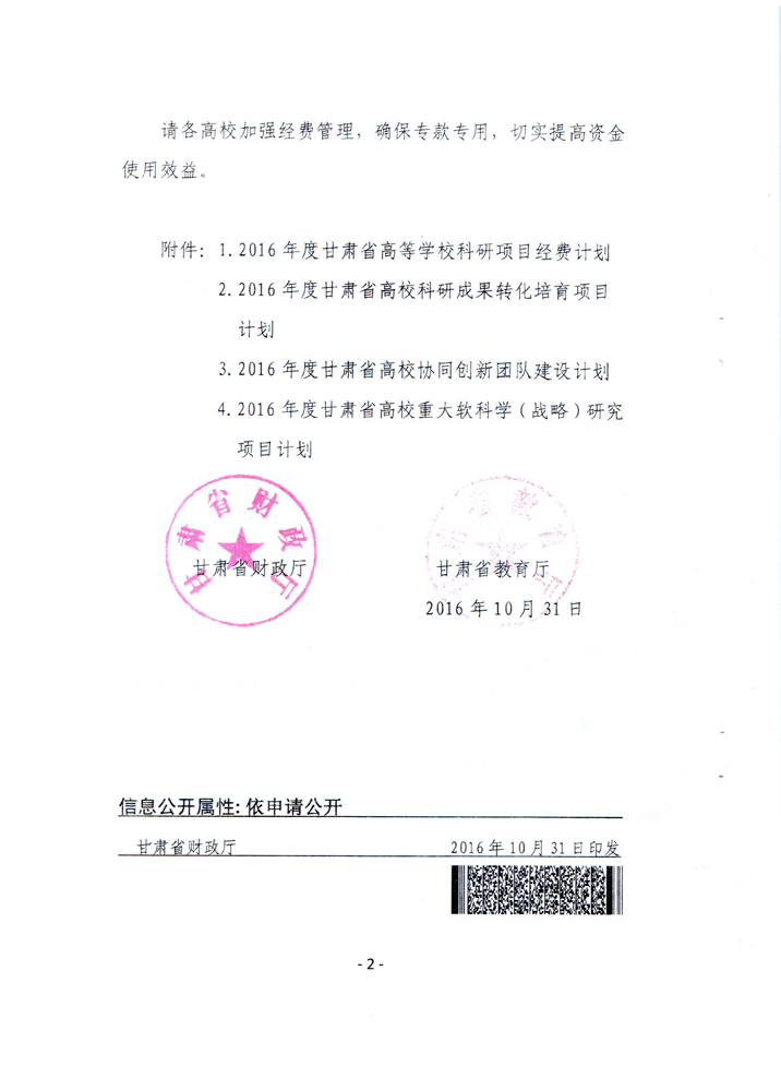 轉(zhuǎn)發(fā)甘肅省財政廳 教育廳文件 關(guān)于下達2016年度甘肅省高等學(xué)??蒲许椖孔浴?/a>[ 12-02 ]