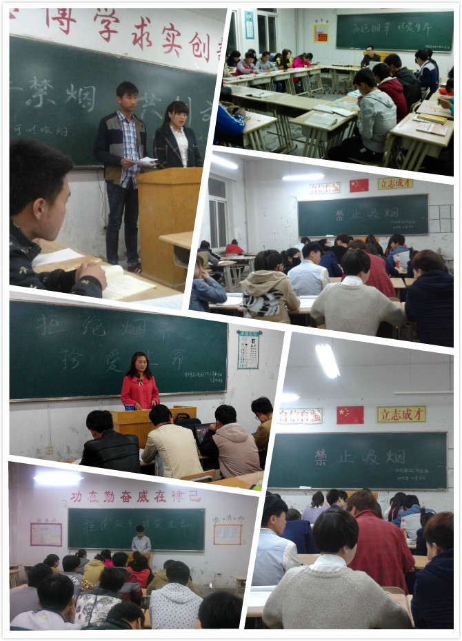 在班會(huì)中,各班主任向同學(xué)們宣讀了學(xué)院《關(guān)于在校園內(nèi)公共場所戒煙的通知》和《校園禁煙倡議書》,并提出作為一名學(xué)生,除了要有遠(yuǎn)大的理想、高尚的情操、淵博的知識(shí)、嚴(yán)謹(jǐn)?shù)募o(jì)律作風(fēng)外,還要有一個(gè)健康的身體。為了我們的健康,我們呼吁,同學(xué)們應(yīng)自覺的遠(yuǎn)離香煙,并勸說吸煙的親友盡快戒煙。讓我們每一位同學(xué)做出承諾,自覺拒絕煙草,遠(yuǎn)離煙草危害。堅(jiān)決不吸煙,拒吸第一支煙,勸告他人不吸煙,不做吸煙的新一代。人人爭做文明、健康、遵紀(jì)守法的好學(xué)生,使每一位師生都擁有一個(gè)健康的生活環(huán)境。