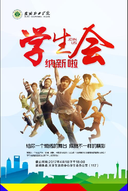 武威職業(yè)學(xué)院學(xué)生會是在學(xué)院黨委領(lǐng)導(dǎo)下,院團委指導(dǎo)下,學(xué)生自發(fā)組織的群眾性學(xué)生組織。為進一步加強學(xué)院學(xué)生會隊伍建設(shè),為廣大同學(xué)提供一個自我鍛煉的平臺,院團委研究決定面向2016級全體同學(xué)公開招聘學(xué)院學(xué)生會干部?,F(xiàn)將具體事宜通知如下: