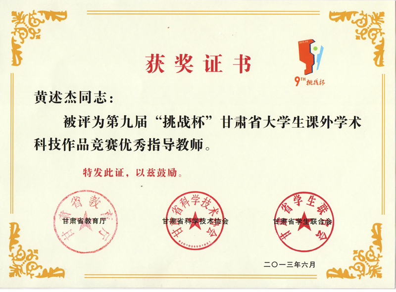黃述杰榮獲第九屆“挑戰(zhàn)杯”甘肅省大學生課外學術(shù)科技作品競賽優(yōu)秀指導(dǎo)教師