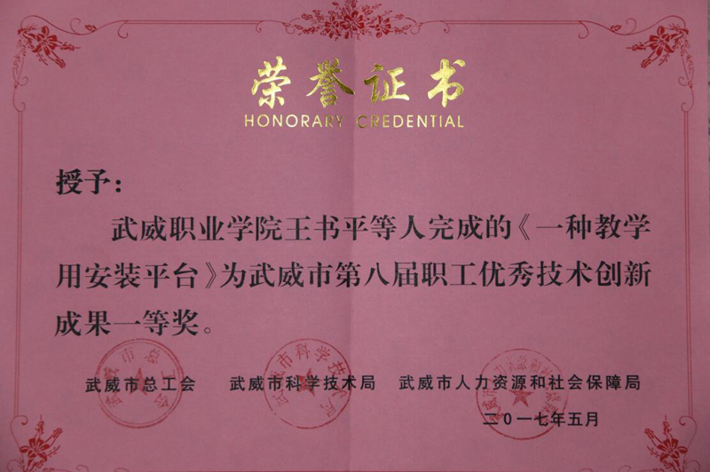 為貫徹落實武威市委、市政府關(guān)于《武威市十萬職工職業(yè)技能素質(zhì)提升活動工作方案(2016-2020年)》(武政辦發(fā)〔2016〕72號)文件精神,推動我市“雙創(chuàng)”工作的深入開展,激發(fā)我市廣大企事業(yè)職工提升技能和開拓創(chuàng)新的熱情。近日,由市總工會、市人社局、市科技局等單位聯(lián)合舉辦了“武威市第八屆職工技術(shù)創(chuàng)新成果評選活動”。本屆職工技術(shù)創(chuàng)新成果評選共征集創(chuàng)新成果87項,其中:學(xué)院推薦了十項研究課題、專利技術(shù)項目,王書平團隊《一種教學(xué)用安裝平臺》項目成果榮獲一等獎,申賓德團隊《簡易焊工考試用帶坡口鋼板火焰切割下料機的研究與應(yīng)用》,王勝團隊《“胰美舒”治療2型糖尿病周圍神經(jīng)病變(氣陰兩虛兼瘀證)的臨床觀察》項目成果榮獲三等獎。