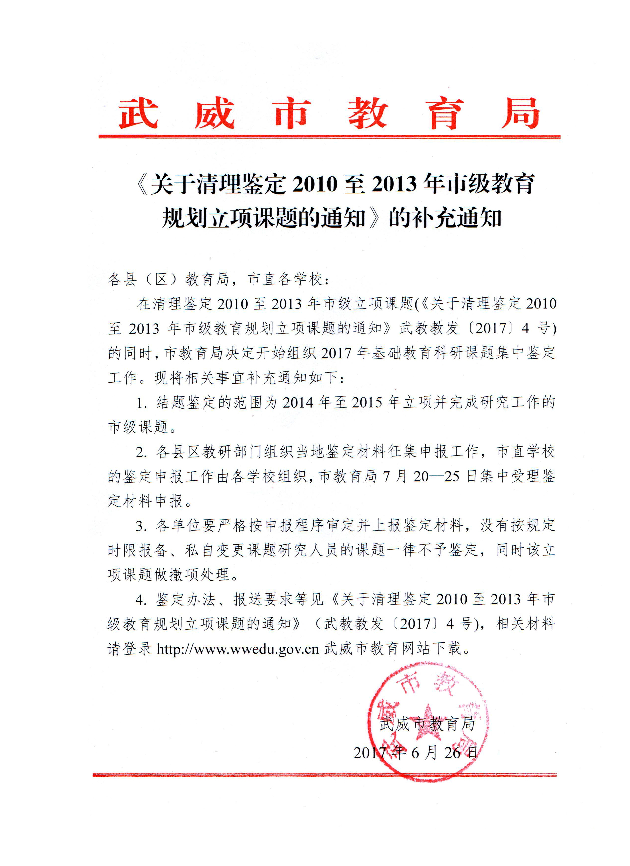 附:武威市教育局<《關于清理鑒定2010至2013年市級規(guī)劃立項課題的通知》的補充通知>