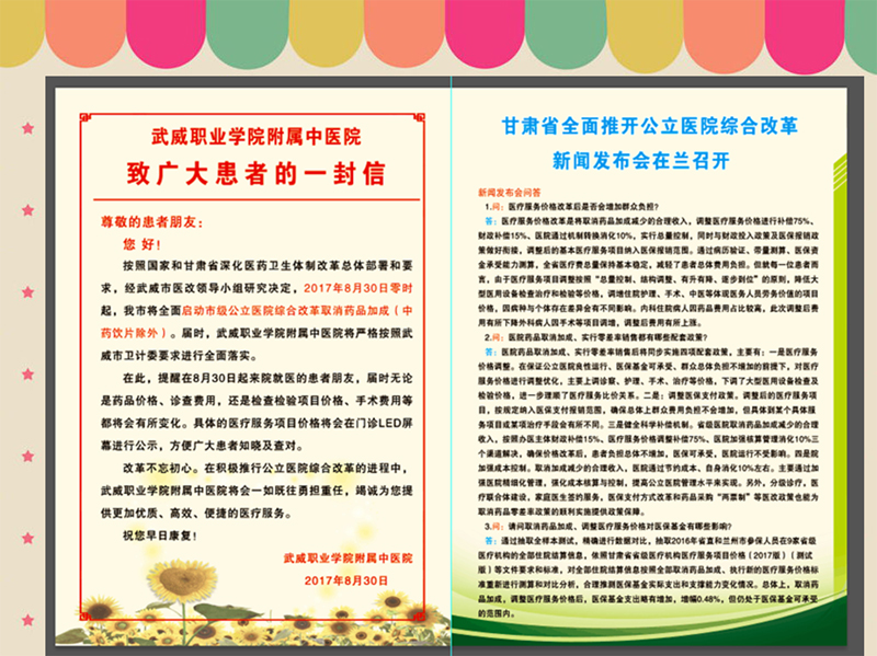 為了搞好公立醫(yī)院綜合改革,醫(yī)院加大對(duì)啟動(dòng)公立醫(yī)院綜合改革工作的宣傳力度,通過(guò)醫(yī)院門診大廳LED屏幕、電子顯示屏、宣傳展架、宣傳彩頁(yè)及微信公眾號(hào)推送等多種方式擴(kuò)大醫(yī)院綜合改革宣傳,對(duì)患者及家屬做好正面引導(dǎo)工作,為醫(yī)院綜合改革任務(wù)的落實(shí)營(yíng)造良好的氛圍。